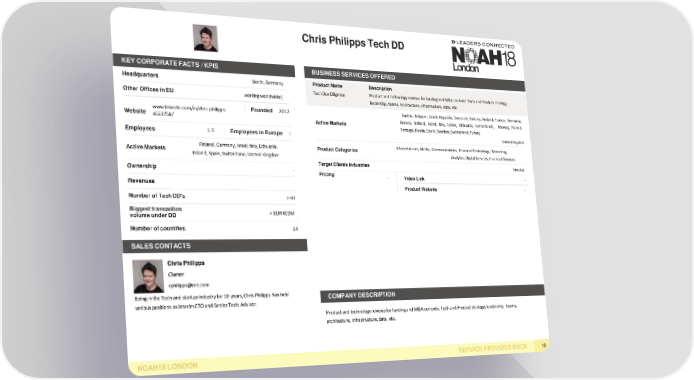 Chris Philipps TechDD KEY CORPORATE FACTS /KPIS BUSINESS SERVICESOFFERED Headquarters Berlin,Germany Product Name Description Tech DueDiligence Product and technology reviews for funding and M&A contexts. Tech and Product strategy, Other Offices inEU working worldwide| leadership, teams, architecture, infrastructure, data, etc. www.linkedin.com/in/chris-philipps- Founded 2012 Austria, Belgium, Czech Republic, Denmark, Estonia, Finland, France, Germany, Website a523758/ Active Markets Greece, Ireland, Israel, Italy, Latvia, Lithuania, Netherlands, Norway, Poland, Portugal,Russia, Spain,Sweden,Switzerland,Turkey, Employees 1-3 EmployeesinEurope 1 UnitedKingdom Finland, Germany, Israel, Italy, Lithuania, ProductCategories Marketplaces, Media, Communications, Financial Technology, Marketing, ActiveMarkets Poland, Spain, Switzerland, United Kingdom Analytics, Digital Services, Financial Services Target ClientsIndustries Investor Ownership - Pricing - VideoLink - Revenues - ProductWebsite - Number of TechDD's >60 Biggesttransaction > EUR400M volume underDD Number ofcountries 14 SALESCONTACTS Chris Philipps Owner [email protected] Being in the Tech and startup industry for 18 years, Chris Philipps has held COMPANYDESCRIPTION various positions as Interim CTO and Senior Tech Advisor. Product and technology reviews for funding and M&A contexts. Tech and Product strategy, leadership, teams, architecture, infrastructure, data, etc. NOAH18LONDON SERVICE PROVIDERBOOK 19