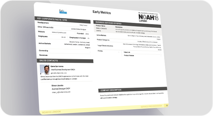 EarlyMetrics KEY CORPORATE FACTS /KPIS BUSINESS SERVICESOFFERED Headquarters Paris,France Product Name Description Rating on Demand & Assess the growth potential and reliability of a targeted start-up and manage the inherent Other Offices inEU London|United Kindgom Sourcing risk anddetectstart-upsin line withyour innovation strategy. Website www.earlymetrics.com Founded 2015 Active Markets Austria, Belgium, France, Germany, Israel, Netherlands, Sweden,United Kingdom Employees 26-50 EmployeesinEurope 45 ProductCategories Analytics, Offline Services, Financial Services Belgium, France, Germany,Israel, Retail, E-Commerce Technology, Marketplaces,Media, Communications, Travel & ActiveMarkets Netherlands, Sweden, Switzerland, United Target ClientsIndustries Transportation, Financial Services, Health, Financial Services, Kingdom Investor Ownership - Pricing - VideoLink - Revenues - ProductWebsite - SALESCONTACTS GeneGerrienne Head Business DevelopmentDACH [email protected] Giving Corporates from the DACH region access to the future with the most qualified startups through Sourcing & Rating on Demand SimonJacobs Business DeveloperDACH [email protected] COMPANYDESCRIPTION Assess the growth potential and reliability of a targeted start-up and manage the inherent risk and detect start-ups in line with your innovation strategy. NOAH18LONDON SERVICE PROVIDERBOOK 28