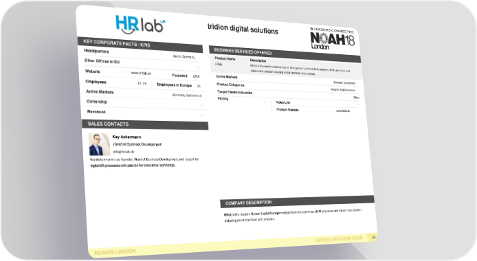 tridion digital solutions KEY CORPORATE FACTS /KPIS BUSINESS SERVICESOFFERED Headquarters Berlin,Germany ProductName Description HRlab HRlab is the modern Human Capital Management platform that combines all HR processesand Other Offices in EU - datain onesolutionincluding smartinterfaces andanalyses. Website www.hrlab.de Founded 2016 Active Markets Germany, Switzerland Employees 11-25 Employeesin Europe 21 ProductCategories Analytics, Digital Services Target ClientsIndustries Other Active Markets Germany, Switzerland Pricing - VideoLink - Ownership - ProductWebsite www.hrlab.de Revenues - SALESCONTACTS KayAckermann Head of BusinessDevelopment info@hrlab.de Kay Ackermann is co-founder, Head of Business Development and expert for digital HR processes with passion for innovative technology. COMPANYDESCRIPTION HRlab is the modern Human Capital Management platform that combines all HR processes and data in one solution including smart interfaces and analyses. NOAH18LONDON SERVICE PROVIDERBOOK 60