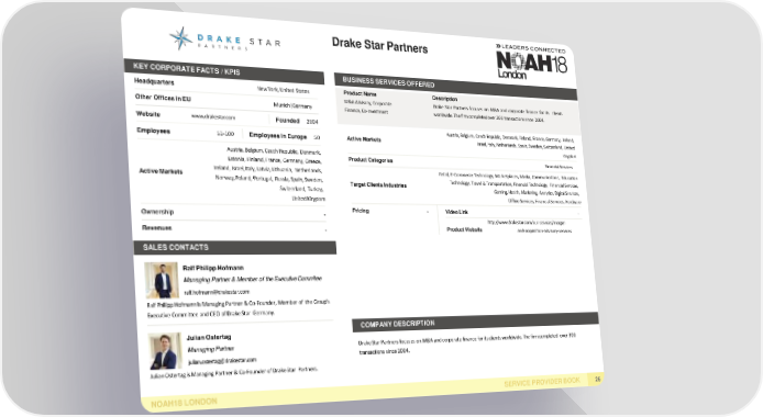 Drake StarPartners KEY CORPORATE FACTS /KPIS BUSINESS SERVICESOFFERED Headquarters New York, UnitedStates Product Name Description M&A Advisory, Corporate Drake Star Partners focuses on M&A and corporate finance for its clients Other Offices inEU Munich|Germany Finance,Co-Investment worldwide.Thefirmcompletedover300transactionssince 2004. Website www.drakestar.com Founded 2004 Austria, Belgium, Czech Republic, Denmark, Finland, France,Germany, Ireland, Employees 51-100 EmployeesinEurope 50 Active Markets Israel, Italy, Netherlands, Spain, Sweden, Switzerland,United Austria, Belgium, Czech Republic, Denmark, Kingdom Estonia, Finland, France, Germany,Greece, ProductCategories FinancialServices ActiveMarkets Ireland, Israel, Italy, Latvia,Lithuania, Netherlands, Retail, E-Commerce Technology, Marketplaces,Media, Communications, Education Norway,Poland,Portugal, Russia, Spain, Sweden, Target ClientsIndustries Technology, Travel & Transportation, FinancialTechnology, Financial Services, Switzerland, Turkey, Gaming, Health, Marketing, Analytics, DigitalServices, UnitedKingdom Offline Services, Financial Services, Hardware Ownership - Pricing - VideoLink - http://www.drakestar.com/our-services/merger- Revenues - ProductWebsite and-acquisition-advisory-services SALESCONTACTS Ralf PhilippHofmann Managing Partner & Member of the ExecutiveCommitee [email protected] Ralf Philipp Hofmann is Managing Partner & Co-Founder, Member of the Group’s Executive Committee and CEO of Drake Star Germany. COMPANYDESCRIPTION JulianOstertag ManagingPartner Drake Star Partners focuses on M&A and corporate finance for its clients worldwide. The firm completed over 300 [email protected] transactions since2004. Julian Ostertag is Managing Partner & Co-Founder of Drake Star Partners. NOAH18LONDON SERVICE PROVIDERBOOK 26