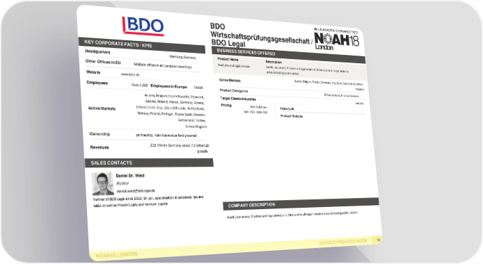 BDO Wirtschaftsprüfungsgesellschaft/ BDOLegal KEY CORPORATE FACTS /KPIS BUSINESS SERVICESOFFERED Headquarters Hamburg,Germany Product Name Description Audit, tax and legal services Audits, tax advice, IT advice and legal advice of all kind and in all major industry Other Offices inEU Multiple offices in all European countries| areas (including public sector) Website www.bdo.de Active Markets Austria, Belgium, France, Germany, Italy, Spain, Switzerland,United Kingdom Employees Over 1,000 EmployeesinEurope 74000 ProductCategories Offline Services, FinancialServices Austria, Belgium, Czech Republic, Denmark, Target ClientsIndustries Investor Estonia, Finland, France, Germany,Greece, Pricing Unit: EUR/hour VideoLink - ActiveMarkets Ireland, Israel, Italy, Latvia,Lithuania, Netherlands, Min: 250 -Max:400 Norway,Poland,Portugal, Russia, Spain, Sweden, ProductWebsite - Switzerland, Turkey, UnitedKingdom Ownership partnership, main sharevalue family-owned Revenues 215 Mio € in Germany, about 7,6 billionUSD globally SALESCONTACTS Daniel Dr.Wied Partner [email protected] Partner of BDO Legal since 2018, Dr. jur., specialisation in corporate law and M&A as well as Private Euqity and Venture Capital COMPANYDESCRIPTION Audits, tax advice, IT advice and legal advice of all kind and in all major industry areas (including public sector) NOAH18LONDON SERVICE PROVIDERBOOK 14