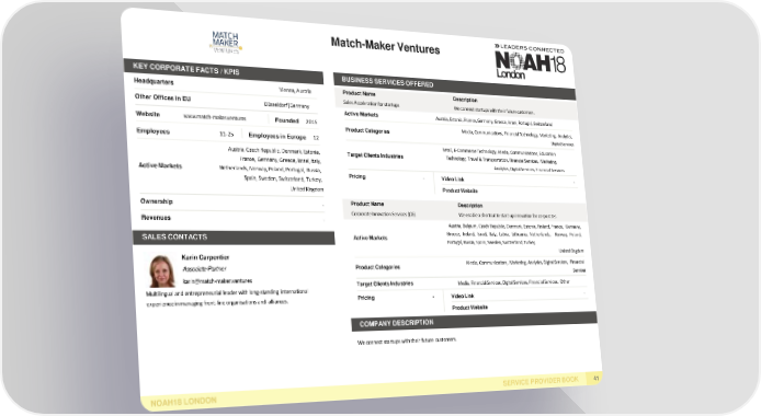 Match-MakerVentures KEY CORPORATE FACTS /KPIS BUSINESS SERVICESOFFERED Headquarters Vienna,Austria Product Name Description Other Offices in EU Sales Acceleration for startups We connect startups with their future customers. Düsseldorf|Germany Active Markets Austria, Estonia, France, Germany, Greece, Israel, Portugal, Switzerland Website www.match-maker.ventures Founded 2015 Media, Communications, Financial Technology, Marketing, Analytics, ProductCategories DigitalServices Employees 11-25 EmployeesinEurope 12 Retail, E-Commerce Technology, Media, Communications, Education Austria, Czech Republic, Denmark,Estonia, Target ClientsIndustries Technology, Travel & Transportation, Financial Services, Marketing, France, Germany, Greece, Israel,Italy, Analytics, Digital Services, Financial Services ActiveMarkets Netherlands, Norway,Poland,Portugal, Russia, Pricing - VideoLink - Spain, Sweden, Switzerland, Turkey, UnitedKingdom ProductWebsite Ownership - Product Name Description Revenues Corporate Innovation Services (CIS) We enable a shortcut to start-up innovation for corporates. - Austria, Belgium, Czech Republic, Denmark, Estonia, Finland, France, Germany, SALESCONTACTS ActiveMarkets Greece, Ireland, Israel, Italy, Latvia, Lithuania, Netherlands, Norway, Poland, Portugal,Russia, Spain,Sweden,Switzerland,Turkey, KarinCarpentier UnitedKingdom AssociatePartner ProductCategories Media, Communications, Marketing, Analytics, Digital Services, Financial Services karin@match-maker.ventures Target ClientsIndustries Media, Financial Services, Digital Services, Financial Services, Other Multilingual and entrepreneurial leader with long-standing international experience in managing front-line organisations and alliances. Pricing - VideoLink - ProductWebsite COMPANYDESCRIPTION We connect startups with their future customers. NOAH18LONDON SERVICE PROVIDERBOOK 41