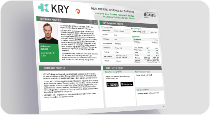 HEALTHCARE, SCIENCE & LEARNING Europe’s Best Funded Telehealth Startup is Sharing its Plans for the Future SPEAKER PROFILE KEY COMPANY FACTS • Johannes is the CEO and co-founder of KRY - the Key Corporate Facts Key Operating KPIs largest provider of digital healthcare in Europe Headquarters Stockholm, Sweden Patient meetings growth 740% in 2017 • In Europe, KRY is expanding under the name LIVI. KRY/LIVI pioneered digital healthcare services by Founded 2015 Key Financials allowing people in need to see a medical doctor or a psychologist via on-demand video consultations. By Employees 200+ Revenues 2017 €1-10m putting the power of access to healthcare in the hands EBITDA 2017 Not Profitable of patients KRY/LIVI is challenging the way society Active Markets International provides primary care at its core. “Our goal is to help as many patients as possible by providing easy and Traffic Aug-17 Aug-18 Johannes equal access to high quality healthcare. What we are Ownership Private – VCs Schildt witnessing is a paradigm shift and this is only the Unique Users 45k 165k beginning”. Funding €79m Visits 112k 323k Co-Founder & • Johannes has been named one of the 2018 “30 under Accel, Index Ventures, Minutes 06:07 01:27 30” in Europe by Forbes Magazine. He is an Key Investors Mobile: 70% Mobile: 80% CEO inspirational lecturer on the future of healthcare and Creandum, Project A Sessions Desktop: 30% Desktop: 20% how to make that future a reality through action Website livi.co.uk Aug 2018 Direct: 20%, Search: 75%, Sources Referrals: 3%, Other: 2% COMPANY PROFILE KRY / LIVI @ NOAH Doing Business @ NOAH Main Presentation Topics • KRY/LIVI allows you to consult a qualified health professional within minutes, via your smartphone or tablet. Through digital technology, KRY/LIVI provides Present your business proposal through Fireside chat with equitable access to high-quality health care—at the patient’s own convenience NOAH Connect app • To date, KRY/LIVI has helped hundreds of thousands of patients in the Nordics alone. Backed by some of Europe’s most renown investors, including Accel and Index Ventures, KRY/LIVI is determined to lead the field of digital health, and fast forward the future of healthcare. Headquartered in Stockholm, Sweden, KRY/LIVI operates in a number of European countries already, and with further international expansion on the agenda Attendees @NOAH • KRY/LIVI’s 200+ employees are committed to improving the world's health through innovation, one patient at a time Johannes Schildt, Co-Founder & CEO 69
