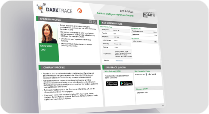 B2B & SAAS Artificial Intelligence for Cyber Security SPEAKER PROFILE KEY COMPANY FACTS • Emilyis responsible for global marketing and Key Corporate Facts Key Operating KPIs communications, a role she has held since Darktrace’s Headquarters London, UK Total Contract Value $400m foundation in 2013 Deployments 7,000 • She is also a commentator on cyber security issues Founded 2013 and has appeared in leading media outlets including Employees 100-1,000 Key Financials BBC News, Sky News and Channel Active Markets Global Latest Valuation $1.65bn • Emily has ten years’ experience in technology marketing Ownership Private – VCs • She has an MA in Modern Languages from the Emily Orton University of Cambridge. Funding $230m Vitruvian Partners, Insight CMO Venture Partners, KKR, Summit Key Investors Partners, Invoke Capital Partners, Talis Capital, SoftBank Website darktrace.com COMPANY PROFILE DARKTRACE @ NOAH Doing Business @ NOAH Main Presentation Topics • Founded in 2013 by mathematicians from the University of Cambridge and government cyber intelligence experts in the US and the UK, Darktrace is Present your business proposal through Fireside chat with recognized today as the world’s leading AI company for cyber security NOAH Connect app • With deep expertise in mathematics and machine learning, as well as operational experience defending critical national assets, our founding team started Darktrace to empower organizations to defend their systems against the most sophisticated cyber-threats • Darktrace is headquartered in San Francisco and Cambridge, UK, with 33 offices globally and over 750 employees Attendees @NOAH • It is privately owned, with investors including KKR, Talis Capital, Hoxton Emily Orton, CMO Ventures, Summit Partners, SoftBank, TenEleven, Samsung Ventures, Invoke Capital, and Insight Venture Partners 33