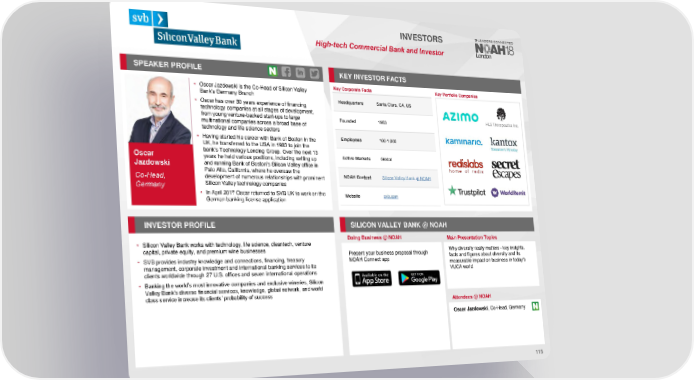 INVESTORS High-tech CommercialBankand Investor SPEAKER PROFILE KEY INVESTORFACTS • Oscar Jazdowski is the Co-Head of Silicon Valley Key Corporate Facts Key Portfolio Companies Bank's Germany Branch Headquarters Santa Clara, CA, US • Oscar has over 30 years experience of financing technology companies at all stages of development, from young venture-backed start-ups to large Founded 1983 multinational companies across a broad base of technology and life science sectors • Having started his career with Bank of Boston in the Employees 100-1,000 UK, he transferred to the USA in 1983 to join the Oscar bank’s Technology Lending Group. Over the next 13 Active Markets Global years he held various positions, including setting up Jazdowski and running Bank of Boston’s Silicon Valley office in Palo Alto, California, where he oversaw the NOAH Content Silicon Valley Bank at NOAH development of numerous relationships with prominent Co-Head, Silicon Valley technology companies Germany • In April 2017 Oscar returned to SVB UK to work on the Website svb.com German banking license application INVESTORPROFILE SILICON VALLEY BANK @ NOAH Doing Business @ NOAH Main Presentation Topics • Silicon Valley Bank works with technology, life science, cleantech, venture capital, private equity, and premium wine businesses Present your business proposal through Why diversity really matters - key insights, • SVB provides industry knowledge and connections, financing, treasury NOAH Connect app facts and figures about diversity and its management, corporate investment and international banking services to its measurable impact on business in today's clients worldwide through 27 U.S. offices and seven international operations VUCA world • Banking the world’s most innovative companies and exclusive wineries, Silicon Valley Bank’s diverse financial services, knowledge, global network, and world class service increase its clients’ probability of success Attendees @NOAH Oscar Jazdowski, Co-Head, Germany 115