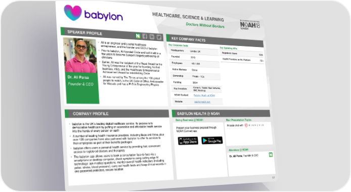 HEALTHCARE, SCIENCE & LEARNING Doctors Without Borders SPEAKER PROFILE KEY COMPANY FACTS • Ali is an engineer and a serial healthcare Key Corporate Facts Key Operating KPIs entrepreneur, and the founder and CEO of babylon Headquarters London, UK Registered Users 800k • Prior to babylon, Ali founded Circle and built it within a Founded 2013 Health Providers on the Platform 120+ few years to become Europe's largest partnership of clinicians • Earlier, Ali was the recipient of the Royal Award for the Employees 100-1,000 Young Entrepreneur of the year for founding his first Active Markets Global business, V&G, and the Healthcare Entrepreneurial Achievement Award for establishing Circle Ownership Private – VCs Dr. Ali Parsa • Ali was named by The Times among the 100 global people to watch, is the UK Cabinet Office Ambassador Funding $85m for Mutuals and has a PhD in Engineering Physics Founder & CEO Key Investors Kinnevik, Vostok New Ventures, NNC Holdings NOAHContent Babylon Health at NOAH Website babylonhealth.com COMPANY PROFILE BABYLON HEALTH @ NOAH Doing Business @ NOAH Main Presentation Topics • babylon is the UK’s leading digital healthcare service. Its purpose is to democratise healthcare by putting an accessible and affordable health service Present your business proposal through Fireside chat with into the hands of every person on earth NOAH Connect app • A number of leading health insurance providers, including Bupa and Aviva, plus over 120 companies have also partnered with babylon to offer its services to their employees as part of their benefits packages • babylon offers users a personal health service by providing fast, convenient access to registered doctors and therapists • The babylon app allows users to book a consultation face-to-face via a Attendees @NOAH smartphone or desktop computer, check symptoms using cutting edge AI Dr. Ali Parsa, Founder & CEO technology; ask medical questions, monitor overall health indicators (including pulse, stress, blood pressure), carry out health tests and keep clinical records in one password protected, secure location 17
