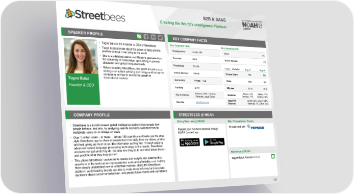 B2B & SAAS Creating the World’s Intelligence Platform SPEAKER PROFILE KEY COMPANY FACTS • Tugce Bulut is the Founder & CEO of Streetbees Key Corporate Facts Key Operating KPIs • Tugce is passionate about the power of data and the Headquarters London, UK Users 1m+ positive change it can bring to the world Founded 2015 Active Markets 150 • She is a published author and Master’s graduate from the University of Cambridge, specialising in poverty alleviation and global living standards Employees 51-100 Traffic Aug-17 Aug-18 • Before founding StreetBees, she spent six years as a Unique Users 29k 30k strategy consultant advising technology and consumer Active Markets Global companies on how to accelerate growth in Tugce Bulut international markets Ownership Private – VCs Visits 102k 92k Funding $17m Minutes 01:34 13:12 Founder & CEO Key Investors Atomico, BGF, Octopus Sessions Mobile: 79% Mobile: 44% Ventures, Local Globe Desktop: 21% Desktop: 56% Website streetbees.com Aug 2018 Direct: 58%, Search: 28%, Sources Referrals: 1%, Other: 13% COMPANY PROFILE STREETBEES @ NOAH Doing Business @ NOAH Main Presentation Topics • Streetbees is a London-based global intelligence platform that reveals how people behave, and why, by analysing real-life moments collected from its Present your business proposal through Fireside chat with worldwide users on an always-on basis NOAH Connect app • Over 1 million users – or ‘bees’ – across 150 countries worldwide use the chat- style Streetbees app to share moments from their daily lives via videos, photos and text, giving as much or as little information as they like. Through applying advanced natural language processing technology to the results, Streetbees uncovers not just what they do, but also why they do it, and what drives them – and predicts what they may do next Attendees @NOAH • This allows Streetbees’ customers to receive rich insights into communities anywhere in the world at an unprecedented scale and affordable cost, helping Tugce Bulut, Founder & CEO them deeply understand new or unfamiliar markets. Using the Streetbees platform, world-leading brands are able to make more informed and accurate decisions about consumer behaviour, and predict future trends with confidence 122