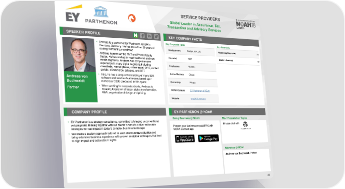 SERVICE PROVIDERS Global Leader in Assurance, Tax, Transaction and Advisory Services SPEAKER PROFILE KEY COMPANY FACTS • Andreas is a partner of EY-Parthenon GmbH in Key Corporate Facts Key Financials Hamburg, Germany. He has more than 20 years of Headquarters Boston, MA, US Operating Countries 24 strategy consulting experience • Andreas focuses on the TMT and Private Equity Founded 1987 Sectors Covered 10 Sector. He has worked in most traditional and new media segments. Andreas has comprehensive experience in many digital segments including Employees 10,000+ classifieds, market places, online travel, OPC, content portals, eCommerce, ad sales, and OTT Active Markets Global Andreas von • Also, he has a deep understanding of many B2B software and services businesses based upon Buchwaldt numerous CDDs conducted in this space Ownership Private • When working for corporate clients, Andreas is Partner focusing largely on strategy, digital transformation, NOAHContent EY-Parthenon at NOAH M&A, organizational design and pricing Website enable2grow.com COMPANY PROFILE EY-PARTHENON @ NOAH Doing Business @ NOAH Main Presentation Topics • EY-Parthenon is a strategy consultancy, committed to bringing unconventional Fireside chat with yet pragmatic thinking together with our clients’ smarts to deliver actionable Present your business proposal through strategies for real impact in today’s complex business landscape NOAH Connect app • We create a custom approach tailored to each client’s unique situation and bring extensive business experience with proven analytical techniques that lead to high-impact and actionable insights Attendees @NOAH Andreas von Buchwaldt,Partner 45