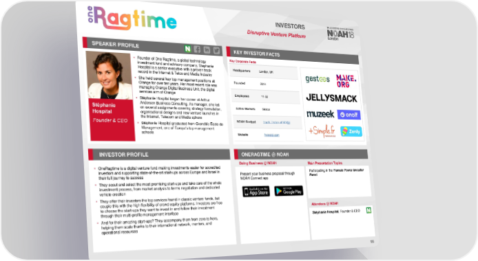 INVESTORS Disruptive Venture Platform SPEAKER PROFILE KEY INVESTORFACTS • Founder of One Ragtime, a global technology Key Corporate Facts investment fund and advisory company, Stephanie Headquarters London, UK Hospital is a senior executive with a proven track record in the Internet & Telco and Media Industry • She held several key top management positions at Founded 2014 Orange for over ten years. Her most recent role was managing Orange Digital Business Unit, the digital services arm of Orange Employees 11-50 • Stéphanie Hospital began her career at Arthur Andersen Business Consulting. As manager, she led Active Markets Global Stéphanie on several assignments covering strategy formulation, Hospital organisational designs and new venture launches in the Internet, Telecom and Media sphere NOAH Content Frank Thelen at NOAH Founder & CEO • Stéphanie Hospital graduated from Grenoble Ecole de Management, one of Europe's top management schools Website freigeist.com INVESTORPROFILE ONERAGTIME @ NOAH Doing Business @ NOAH Main Presentation Topics • OneRagtime is a digital venture fund making investments easier for accredited investors and supporting state-of-the-art start-ups across Europe and Israel in Present your business proposal through Participating in the Female Power Investor their full journey to success NOAH Connect app Panel • They scout and select the most promising start-ups and take care of the whole investment process, from market analysis to terms negotiation and dedicated vehicle creation • They offer their investors the top services found in classic venture funds, but couple this with the high flexibility of crowd equity platforms. Investors are free to choose the start-ups they want to invest in and follow their investment Attendees @NOAH through their multi-profile management interface • And for their amazing start-ups? They accompany them from zero to hero, Stéphanie Hospital, Founder & CEO helping them scale thanks to their international network, mentors, and operational resources 95