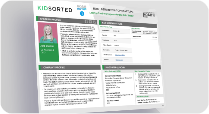 NOAH BERLIN 2018 TOP STARTUPS 1 Leading SaaS-marketplace for the Kids’ Sector SPEAKER PROFILE KEY COMPANY FACTS Key Corporate Facts Traffic Information • Julia has extensive e-commerce, marketplaces, and User Acquisition Social 37%, SEO 26%, Direct digital marketing experience. She is Co-Founder and Headquarters London, UK Channels 25%, Referral 6%, E-Mail 6% CEO of Kidsorted, a London-based SaaS-enabled marketplace for kids activities and services Founded 2014 Session Growth 20% MoM • Previously, Julia was Head of Marketing EMEA at Stella & Dot, led the eBay Fashion Outlet for UK and Germany, launched the first E-Commerce Online Employees 4-10 Store of the Middle East, Boutique1.com (Dubai based multi-brand luxury fashion retailer), and was Managing Active Markets National Director at Mythresa.com (bought by Neiman Marcus). Julia Brucher Julia has degrees from Babson College, Boston, MA and Parsons School of Design, NY Ownership Private – Business Angels Co-Founder & • Julia is on a mission to channel her passion and CEO perseverance to make the Kidsorted vision to become NOAHContent Kidsorted at NOAH the biggest tech platform in the kids' sector reality Website kidsorted.com COMPANY PROFILE KIDSORTED @ NOAH Doing Business @ NOAH Main Presentation Topics • Kidsorted is the little black book for your family. Our vision is to be the world’s 1. Cracking a £19bn market in the UK: the largest technology platform for kids’ activities and services. We build the Service Provider Interest kids' activity sector is fragmented, hyper technology to allow anyone to create, promote, find and book experiences and Automation / Campaign & Lead Management local and still ready to be disrupted services that enrich children’s lives. Kidsorted is a hybrid of marketplace and SaaS. The platform currently covers Greater London, where parents can find Conversion Improvement 2. SaaS-enabled marketplace: why our and book activities & services for their children based on postcode, age and Loyalty / Referral / Gamification software is so critical for our business interest search Mobile Marketing model and how we use it to scale • For providers, we offer marketing and booking functionality: the Kidsorted Personalisation & Chat 3. Creating hyper-flexible roles: how we booking software powers the marketplace and it can also be embedded in SEO work with local parents to curate great provider websites as a white label SaaS solution. Kidsorted uses a unique inventory and at the same time give model to curate and vet providers by working with local parents, the Kidsorted Partnerships Interest access to digital know-how and a Local Community Managers Kids sector, media partnerships, brands that portfolio career • Providing digital training and access to a portfolio career is an important value of are catering to families Attendees @NOAH the Kidsorted team and we look forward to scaling this model in future Key Hires Interest expansion markets including big metropolitan cities in the US CTO Julia Brucher, Co-Founder & CEO Lindsay Trombley, Co-Founder & COO 65