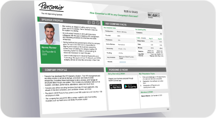 B2B & SAAS How Essentialis HR to any Company’s Success? SPEAKER PROFILE KEY COMPANY FACTS • After working as skipper of sailing yachts for many Key Corporate Facts Key Operating KPIs years next to his studies, Hanno decided to become Headquarters Munich, Germany Customers 800 the captain of a startup • He co-founded Personio in 2015 with three study Founded 2015 Traffic Aug-17 Aug-18 colleagues with the goal of digitizing HR management and Recruiting processes for small and mid-sized Employees 100+ Unique Users 0.1m 0.2m enterprises • Having build and led several teams while the company Active Markets International Visits 0.3m 0.6m grew, he now in the CEO role is responsible for Minutes 02:20 03:44 Hanno Renner aligning all functions of the business around the Ownership Private – VCs shares vision of building the category leading HR Sessions Mobile: 34% Mobile: 30% Operating System for SMEs in and providing all Desktop: 64% Desktop: 70% Funding €12.5m Co-Founder & resources necessary to reach this goal Aug 2018 Direct: 53%, Search: 7%, Sources Referrals: 30%, Other: 10% CEO • Hanno holds degrees in Industrial Engineering and Northzone, Global Founders Technology Management from TU Munich and CDTM, Key Investors Capital studying abroad at Columbia University in New York Website personio.de COMPANY PROFILE PERSONIO @ NOAH Doing Business @ NOAH Main Presentation Topics • Personio has developed the HR Operating System. Their HR management and recruiting solution is aimed at startups, and small- and medium-sized Present your business proposal through 1. Pains and challenges in HR departments enterprises. It enables these businesses to store, process, and manage all NOAH Connect app of small and mid sized companies employee data through one system. This includes any workplace data such as 2. Explanation how software can solve vacation, sick days, performance, attendance, salary and much more them • Personio also offers recruiting functions that help HR track applicants, stay 3. Introduction of Personio and ahead of interview schedules, post candidate reviews, and more development to date • Founded in 2015 Personio has grown to over 800 customers and more than 100 employees to date Attendees @NOAH • The company has raised €12.5M in venture capital to date from leading Hanno Renner, Co-Founder & CEO investors such as Northzone and Global Founders capital 102