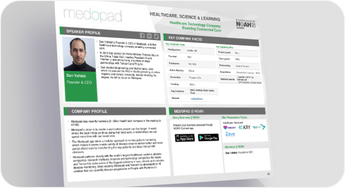 HEALTHCARE, SCIENCE & LEARNING HealthcareTechnology Company Enabling Connected Care SPEAKER PROFILE KEY COMPANY FACTS • Dan Vahdat is Founder & CEO of Medopad, a British Key Corporate Facts Key Operating KPIs healthcare technology company enabling connected Headquarters London, UK Project growth 10x + care. • In 2018 Dan joined UK Prime Minister Theresa May on Founded 2011 Team growth 730% the China Trade Visit, meeting President Xi and Premier Li and announcing a number of major Employees 100-1000 Partnerships Apple & Tencent partnerships with Tencent and Ping An. • Dan studied Engineering and Mathematics, after Active Markets Global Acquisitions Sherbit (San Francisco - 2018) which he pursued his PhD in Bio-Engineering at Johns - LinkedIn’s 2018 Top Dan Vahdat Hopkins and Oxford University. Before finishing his Ownership Private – VCs Selected awards Startups List degree, he left to focus on Medopad. - UK Innovation is Great Award Funding $35m+ Founder & CEO Key Investors NWS Holdings, Bayer Leaps, Bupa Website medopad.com COMPANY PROFILE MEDOPAD @ NOAH Doing Business @ NOAH Main Presentation Topics • Medopad was recently named a $1 billion health tech company in the making by KPMG Present your business proposal through Healthcare Panel with • Medopad’s vision is to create a world where people can live longer. A world NOAH Connect app where the best minds continue doing their best work. A world where we can spend more time with our loved ones • The Medopad app takes a modular approach to remote patient monitoring which means it covers a wide variety of disease areas to deliver better and more personalised care by transforming the way patients and data interact with clinicians Attendees @NOAH • Medopad partners closely with the world’s largest healthcare systems, pharma Dan Vahdat, Founder & CEO companies, research institutes, insurers and technology companies like Apple and Tencent to solve some of the biggest problems in rare, chronic and complex disease monitoring. Most recently Medopad and Tencent co-developed an AI solution that can quantify disease progression in People with Parkinson’s 80