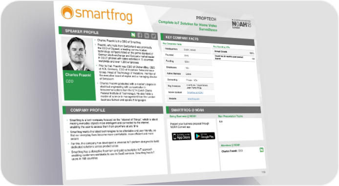 PROPTECH Complete IoT Solution for Home Video Surveillance SPEAKER PROFILE KEY COMPANY FACTS • Charles Fraenkl is the CEO of Smartfrog Key Corporate Facts Key Operating KPIs • Fraenkl, who hails from Switzerland was previously Headquarters Dublin, Ireland Annual Growth 880% the CEO of Gigaset, a leading communication Countries 20 months past product technology company listed on the prime standard of Founded 2015 launch 168 German stock-exchange and Europe's market leader in DECT phones with sales activities in 70 countries Funding $32m worldwide and over 1,200 employees • Prior to that, Fraenkl was CEO of ClickandBuy, CEO Employees 100+ of AOL Germany, CEO of Vodafone Telecommerce Active Markets Global Group, Head of Technology of Vodafone, member of Charles Fraenkl the executive board of e-plus and a managing director Ownership Private - VCs of Swisscom CEO • Charles Fraenkl graduated with a master’s degree in Key Investors e.ventures, Target Global, electrical engineering with concentration in Jean-Pierre Wyss telecommunications from the ETH Zurich (Swiss NOAH Content Smartfrog at NOAH Federal Institute of Technology). He also holds a master of science in management from the London Website smartfrog.com business School and speaks 5 languages COMPANY PROFILE SMARTFROG @ NOAH Doing Business @ NOAH Main Presentation Topics • Smartfrog is a tech company focused on the “Internet of Things”, which is about making everyday objects more intelligent and connected to the internet, Present your business proposal through N/A enabling the user to access them from anywhere at any time NOAH Connect app • Smartfrog wants the latest technologies to be affordable and user-friendly, so that our everyday lives become more comfortable, more efficient and more secure • For this, the company has developed a universal IoT-platform designed to build dedicated solutions across product areas • Smartfrog has a disruptive freemium and paid subscription IoT approach Attendees @NOAH enabling customers worldwide to use its SaaS services. Smartfrog has IoT Charles Fraenkl, CEO users in 168 countries 118