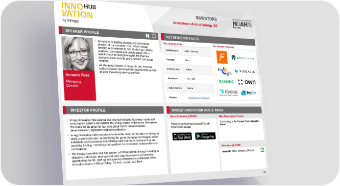 INVESTORS Investment Arm of innogy SE SPEAKER PROFILE KEY INVESTORFACTS • Annemieis co-leading strategic and commercial Key Corporate Facts Key Portfolio Companies direction of the Innovation Hub, which includes Headquarters Essen, Germany deciding on investment in over 50 start-ups, driving customer, commercial and people growth with a specific focus on disruptive digital, the machine Founded 2014 economy, cyber security and smart and connected ventures • As Managing Director of innogy UK Ltd, Annemie Portfolio Size €150m seeks to source new investment opportunities as well as grow the existing start-up portfolio Annemie Ress Employees 100-1,000 Managing Director Active Markets Global Website innovationhub.innogy.com INVESTORPROFILE INNOGY INNOVATION HUB @ NOAH Doing Business @ NOAH Main Presentation Topics • innogy Innovation Hub believes that new technologies, business models and consumption patterns will redefine the energy market of the future. We believe Present your business proposal through Participating in the Female Power Investor this future will be driven by four core global trends; decarbonisation, NOAH Connect app Panel decentralisation, digitisation and democratisation • innogy Innovation Hub’s mission is to drive this vision for the future of energy by being a sector disruptor: by identifying the game-changing technologies, ideas, individuals and businesses that will help build that future, wherever they are, providing funding, mentoring and a platform for co-creation, collaboration and convergence Attendees @NOAH • The innogy Innovation Hub has created a €150m portfolio through investing in disruptive individuals, start-ups and early stage businesses and provided Annemie Ress, Managing Director opportunities for 80+ start-up and scale-up companies to collaborate. It has innovation teams in Silicon Valley, Tel Aviv, London and Berlin 60