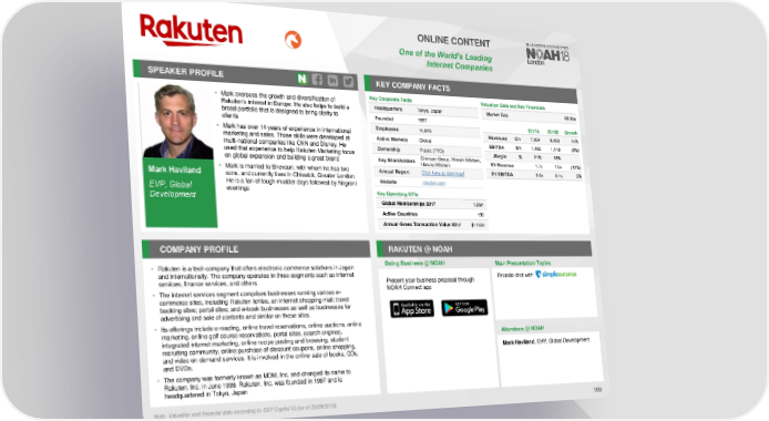 ONLINE CONTENT One of the World’s Leading Internet Companies SPEAKER PROFILE KEY COMPANY FACTS • Mark oversees the growth and diversification of Key Corporate Facts Valuation Data and Key Financials Headquarters Tokyo, Japan Market Cap €8.9bn Rakuten’s interest in Europe. He also helps to build a broad portfolio that is designed to bring clarity to Founded 1997 clients 2017A 2018E Growth • Mark has over 14 years of experience in international Employees 14,845 Revenues €m 7,054 8,053 14% marketing and sales. Those skills were developed at Active Markets Global EBITDA €m 1,495 1,418 (5%) multi-national companies like CNN and Disney. He Ownership Public (TYO) used that experience to help Rakuten Marketing focus Crimson Group, Hiroshi Mikitani, Margin % 21% 18% on global expansion and building a great brand Key Shareholders Haruko Mikitani EV/Revenue 1.7x 1.5x (12%) Mark Haviland • Mark is married to Shevaun, with whom he has two Annual Report Click here to download EV/EBITDA 8.0x 8.4x 5% sons, and currently lives in Chiswick, Greater London. Website rakuten.com He is a fan of tough mudder days followed by Negroni EVP, Global evenings Key Operating KPIs Development Global Memberships 2017 1.2bn Active Countries 190 Annual Gross Transaction Value 2017 $115bn COMPANY PROFILE RAKUTEN @ NOAH • Rakuten is a tech company that offers electronic commerce solutions in Japan Doing Business @ NOAH Main Presentation Topics and internationally. The company operates in three segments such as internet Fireside chat with services, finance services, and others Present your business proposal through • The internet services segment comprises businesses running various e- NOAH Connect app commerce sites, including Rakuten Ichiba, an internet shopping mall; travel booking sites; portal sites; and e-book businesses as well as businesses for advertising and sale of contents and similar on these sites. • Its offerings include e-reading, online travel reservations, online auctions, online marketing, online golf course reservations, portal sites, search engines, Attendees @NOAH integrated internet marketing, online recipe posting and browsing, student recruiting community, online purchase of discount coupons, online shopping, Mark Haviland, EVP, Global Development and video on demand services. It is involved in the online sale of books, CDs, and DVDs. • The company was formerly known as MDM, Inc. and changed its name to Rakuten, Inc. in June 1999. Rakuten, Inc. was founded in 1997 and is headquartered in Tokyo, Japan Note: Valuation and financial data according to S&P Capital IQ (as of 25/09/2018). 109