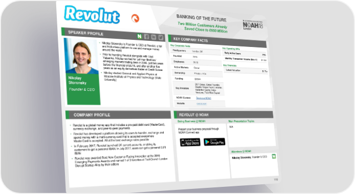 BANKING OF THE FUTURE TwoMillion CustomersAlready SavedClose to £600Million SPEAKER PROFILE KEY COMPANY FACTS • Nikolay Storonsky is Founder & CEO at Revolut, a fair Key Corporate Facts Key Operating KPIs and frictionless platform to use and manage money Headquarters London, UK Daily Active Users 250k around the world Monthly Transaction Volume (Dec-17) $1.5bn • Prior to founding Revolut alongside with Vlad Founded 2015 Yatsenko, Nikolay worked for Lehman Brothers’ Employees 26-50 Key Financials emerging markets trading desk in 2006, just two years before the financial crisis hit, and after another five Active Markets Global Latest Valuation $1.7bn years as an equity derivatives trader at Credit Suisse Ownership Private – VCs • Nikolay studied General and Applied Physics at Nikolay Moscow Institute of Physics and Technology (State Funding $336m University) DST Global, Global Foundes Storonsky Capital, Draper Esprit, Lakestar, Key Investors Balderton Capital, Index Founder & CEO Ventures, Point Nine Capital NOAHContent Revolut at NOAH Website revolut.com COMPANY PROFILE REVOLUT @ NOAH Doing Business @ NOAH Main Presentation Topics • Revolut is a global money app that includes a pre-paid debit card (MasterCard), currency exchange, and peer-to-peer payments Present your business proposal through N/A • Revolut has developed a platform allowing its users to transfer, exchange and NOAH Connect app spend money with a multi-currency card that is accepted everywhere MasterCard is accepted. All at the best exchange rates possible • In February 2017, Revolut launched UK current accounts, enabling its customers to get a personal IBAN. In July 2017, users can get a personal EUR IBAN • Revolut was awarded Best New Customer Facing Innovation at the 2016 Attendees @NOAH Emerging Payments Awards and named 1 of 3 favorites at TechCrunch London Nikolay Storonsky, Founder & CEO Disrupt Startup Alley by their editors 110