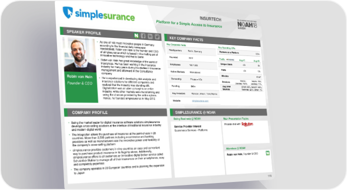 INSURTECH Platform for a Simple Accessto Insurance SPEAKER PROFILE KEY COMPANY FACTS • As one of 100 most innovative people in Germany Key Corporate Facts Key Operating KPIs according to the financial daily newspaper Headquarters Berlin, Germany Partners on a Platform 2.5k+ Handelsblatt, Robin von Hein is the founder and CEO of simplesurance which is based in the melting pot of Founded 2012 Traffic Aug-17 Aug-18 innovative technology and that is Berlin • Robin von Hein has great knowledge of the world of Unique Users <5k 6k insurances. He has been working in the insurance Employees 100-1,000 industry for many years during his studies in insurance Visits <5k 13k management and afterward in the Consultancy Active Markets International company Minutes - 01:47 Robin von Hein • He is experienced in developing risk analysis and Ownership Private – VCs Sessions Mobile: - Mobile: 23% insurance solutions for different companies and Desktop: 100% Desktop: 77% Aug 2018 Direct: 49%, Search: 30%, Founder & CEO realized that the industry was standing still. Funding $60m Digitalization was an alien concept to an entire Sources Referrals: 20%, Other: 1% industry, while other markets were transforming and Key Investors Rakuten, Allianz, Tokio Marine using the chances provided by the online sphere. Hence, he founded simplesurance in May 2012 Website simplesurance.com COMPANY PROFILE SIMPLESURANCE @ NOAH Doing Business @ NOAH Main Presentation Topics • Being the market leader for digital insurance software solutions simplesurance develops cross-selling solutions at the interface of traditional insurance industry Service Provider Interest Fireside chat with and modern digital world Ecommerce Services - Platforms • The integration allows the purchase of insurance at the point-of-sale in 28 countries. More than 2,500 partners including e-commerce and banking providers as well as manufacturers use the innovative power and flexibility of the company’s cross-selling platform • simplesurance provides customers in nine countries an easy and convenient way to purchase product insurance in its flagship stores. Additionally, Attendees @NOAH simplesurance offers to all customers an innovative digital broker service called Schutzklick Makler to manage all of their insurances on their smartphones, easy Robin von Hein, Founder & CEO and completely paperless • The company operates in 28 European countries and is planning the expansion to Japan 116