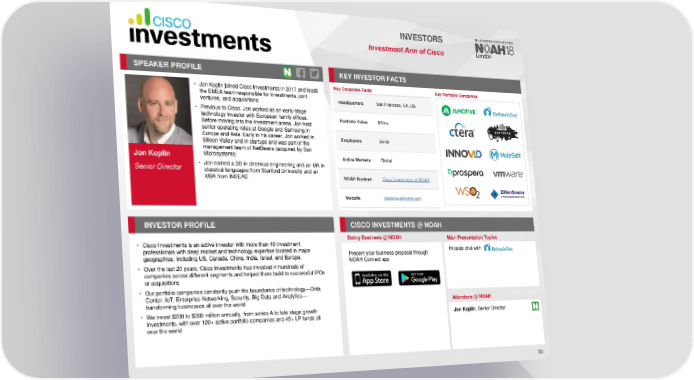 INVESTORS Investment Arm of Cisco SPEAKER PROFILE KEY INVESTORFACTS • Jon Koplin joined Cisco Investments in 2017 and leads Key Corporate Facts Key Portfolio Companies the EMEA team responsible for investments, joint Headquarters San Francisco, CA, US ventures, and acquisitions • Previous to Cisco, Jon worked as an early-stage technology investor with European family offices. Portfolio Value $2bn+ Before moving into the investment arena, Jon held senior operating roles at Google and Samsung in Europe and Asia. Early in his career, Jon worked in Employees 25-50 Silicon Valley and in startups and was part of the management team of NetBeans (acquired by Sun Jon Koplin Microsystems) Active Markets Global • Jon earned a BS in chemical engineering and an MA in Senior Director classical languages from Stanford University and an MBA from INSEAD NOAHContent Cisco Investments at NOAH Website ciscoinvestments.com INVESTORPROFILE CISCO INVESTMENTS @ NOAH Doing Business @ NOAH Main Presentation Topics • Cisco Investments is an active investor with more than 40 investment professionals with deep market and technology expertise located in major Present your business proposal through Fireside chat with geographies, including US, Canada, China, India, Israel, and Europe. NOAH Connect app • Over the last 20 years, Cisco Investments has invested in hundreds of companies across different segments and helped them build to successful IPOs or acquisitions • Our portfolio companies constantly push the boundaries of technology—Data Center, IoT, Enterprise Networking, Security, Big Data and Analytics— transforming businesses all over the world Attendees @NOAH • We invest $200 to $300 million annually, from series A to late stage growth Jon Koplin, Senior Director investments, with over 120+ active portfolio companies and 45+ LP funds all over the world 30