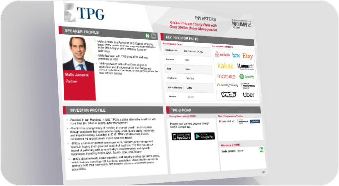 INVESTORS Global Private Equity Firm with Over $94bn Under Management SPEAKER PROFILE KEY INVESTORFACTS • Malte Janzarik is a Partner at TPG Capital, where he Key Corporate Facts Key Portfolio Companies leads TPG’s growth and later stage equity investments Headquarters San Francisco, CA, US in the EMEA region with a particular focus on technology • Malte has been with TPG since 2005 and was Founded 1992 previously at UBS • Malte graduated with a First Class degree in economics from the University of Cambridge and AUM $94bn earned his MBA at Harvard Business School, where he Malte Janzarik was a Baker Scholar Employees 100-1,000 Partner Active Markets Global Website tpg.com INVESTORPROFILE TPG @ NOAH Doing Business @ NOAH Main Presentation Topics • -Founded in San Francisco in 1992, TPG is a global alternative asset firm with more than $94 billion of assets under management Present your business proposal through Fireside chat with • -The firm has a long history of investing in change, growth, and innovation NOAH Connect app through a platform that spans private equity, credit, public equity, real estate, and impact investing. Launched in 2016, TPG’s $2 billion Rise Fund is considered the largest private impact fund ever raised • -TPG is a hands-on partner to entrepreneurs, founders, and management teams in helping them grow and scale their business. The firm has a track record of partnering with some of today’s most innovative and dynamic Attendees @NOAH businesses, including Airbnb, CAA, Spotify, Uber, and Zscaler • -TPG’s global network, sector expertise, and industry-leading operations group, Malte Janzarik, Partner which features more than 100 functional specialties, allows the firm to help its partners build their businesses, find creative solutions, and unlock greater possibilities 129