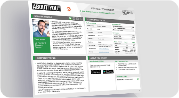 VERTICAL ECOMMERCE A New Social Fashion Ecommerce Unicorn SPEAKER PROFILE KEY COMPANY FACTS • Tarek Müller (29) is one of the co-founders and Key Corporate Facts Key Operating KPIs managing directors of ABOUT YOU. Müller has been Headquarters Hamburg, Germany Monthly Active Users 10m+ developing digital business models for online retail for Annual Transaction Volume €1.6bn over ten years and is responsible for marketing and Founded 2013 Brands on a Platform 1k+ brands at ABOUT YOU. • The entrepreneur founded his first online shop at the Employees 100-1,000 Key Financials age of 13. He subsequently built up countless e- Latest Valuation $1bn+ commerce models in various industries as a managing Active Markets International Revenues 2017 €283m partner. Starting in 2007, he also established service Revenues 2018E €450-480m companies to support clients with the development Ownership Private – VCs and execution of new business models. Tarek Müller Funding $300m Traffic Aug-17 Aug-18 • Born in Hamburg, Tarek Müller is also founder and Unique Users 2.8m 2.8m Co-Founder & partner in eTribes Framework GmbH, which was Key Investors Bestseller, SevenVentures, Otto Visits 5.6m 5.7m established in 2011. He is active as an investor and a Group. German Media Pool Managing Minutes 04:42 04:31 business angel as well. All in all, he holds stakes in Mobile: 73% Mobile: 67% Director more than 15 companies NOAHContent ABOUT YOU at NOAH Sessions Desktop: 28% Desktop: 33% Website corporate.aboutyou.de Aug 2018 Direct: 39%, Search: 42%, Sources Referrals: 8x%, Other: 11% COMPANY PROFILE ABOUT YOU @ NOAH Doing Business @ NOAH Main Presentation Topics • ABOUT YOU is digitalizing the classic shopping stroll by creating an inspiring and personalized shopping experience on the smartphone. The platform is Present your business proposal through 1. ABOUT YOU vision to digitalize classic window shopping tailoring the site to each customer’s individual style. At ABOUT YOU, the focus NOAH Connect app is on the customer and as such, the infinite number of different personalities 2. Growth strategy and internationalization which find their expression through fashion and are supported by ABOUT YOU 3. Success story up to Unicorn status • In addition to a wide range of inspirations, women and men between 20 and 49 years of age will also find an assortment of more than 150,000 articles from over 1,000 brands at aboutyou.com. With more than 10 million monthly active users, ABOUT YOU is one of the largest fashion and lifestyle platforms in Europe. The Attendees @NOAH fashion-tech company has made sales of €283 million in 2017/18 and is expecting sales of €450-480 million in the current financial year, which is equal Tarek Müller, Co-Founder & MD to an annual transaction volume of more than €1.6 billion. The company is currently valued at over one billion US dollars, which makes ABOUT YOU Hamburg’s first unicorn. • ABOUT YOU GmbH was founded in 2014 as a subsidiary of the Otto Group and is part of the Group’s portfolio today 10