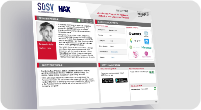 INVESTORS Accelerator Program for Hardware, Robotics, and Connected Devices SPEAKER PROFILE KEY INVESTORFACTS • As Partner at HAX, Benjamin works with our startups Key Corporate Facts Key Portfolio Companies on strategy, marketing, PR and fundraising. He is Headquarters Shenzen, China considered a global thought leader on hardware innovation and ecosystems, and represents HAX in many global events Founded 2011 • Moving from France to Asia in 2000, Benjamin is a reformed mechanical engineer who turned to strategy and worked in Japan, South Korea and China. He now Employees 11-25 splits his time between Hong Kong, Shenzhen and the world. His experience covers several tech industries: Benjamin Joffe telecom, mobile, gaming and hardware. Active Markets Global • Prior to HAX, Benjamin was the founder of a strategy Partner, HAX consultancy which researched Asia-based digital innovations, with clients such as Microsoft, Citi and NOAHContent HAX at NOAH Harvard Business School. He also founded Mobile Monday Beijing, a community of thousands of mobile industry professionals in China, running over 40 events Website hax.co INVESTORPROFILE SOSV / HAX @ NOAH Doing Business @ NOAH Main Presentation Topics • Founded by Sean O’Sullivan, SOSV is a $300M venture capital company, operating accelerators in the areas of hardware, software, biology, food, Present your business proposal through Fireside chat with Marco Rodzynek robotics, medical devices, transportation, green energy and more NOAH Connect app • HAX is a two-stage program that starts in Shenzhen and finishes in San Francisco. Companies that are admitted to the program will spend four to eight months in Shenzhen co-developing technology, followed by two to three months in San Francisco, where we will work with you on business development, fundraising, and growth Attendees @NOAH Benjamin Joffe, Partner, HAX 120
