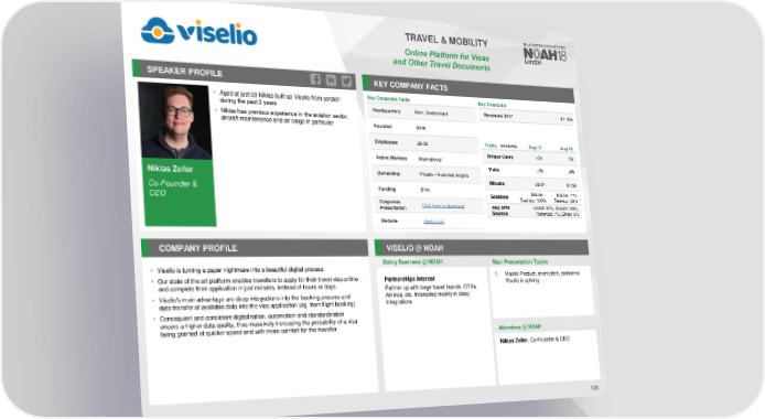TRAVEL & MOBILITY Online Platform for Visas and Other Travel Documents SPEAKER PROFILE KEY COMPANY FACTS • Aged at just 23 Niklas built up Viselio from scratch Key Corporate Facts Key Financials during the past 2 years Headquarters Bern, Switzerland Revenues 2017 €1-10m • Niklas has previous experience in the aviation sector, aircraft maintenance and air cargo in particular Founded 2016 Employees 26-50 Traffic Aug-17 Aug-18 Active Markets International Unique Users <5k 15k Visits <5k 46k Niklas Zeller Ownership Private – Business Angels Minutes 00:04 01:50 Co-Founder & Funding €1m Mobile: - Mobile: 71% Sessions Desktop: 100% Desktop: 29% CEO Corporate Presentation Click here to download Aug 2018 Direct: 37%, Search: 50%, Sources Referrals: 7%, Other: 6% Website viselio.com COMPANY PROFILE VISELIO @ NOAH Doing Business @ NOAH Main Presentation Topics • Viselio is turning a paper nightmare into a beautiful digital process • Our state of the art platform enables travellers to apply for their travel visa online Partnerships Interest 1. Viselio Product, short pitch, problems and complete their application in just minutes, instead of hours or days Partner up with large travel brands, OTAs, Viselio is solving • Viselio's main advantage are deep integrations into the booking process and Airlines, etc. Interested mainly in deep data transfer of available data into the visa application (eg. from flight booking) integrations • Consequent and consistent digitalization, automation and standardization ensure a higher data quality, thus massively increasing the probability of a visa being granted at quicker speed and with more comfort for the traveller Attendees @NOAH Niklas Zeller, Co-Founder & CEO 135