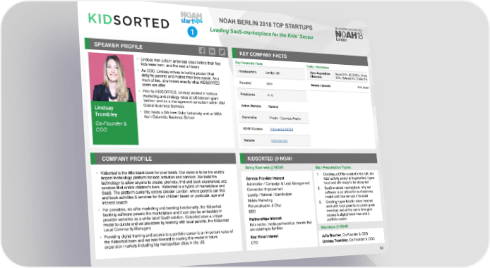 NOAH BERLIN 2018 TOP STARTUPS 1 Leading SaaS-marketplace for the Kids’ Sector SPEAKER PROFILE KEY COMPANY FACTS • Lindsay met Julia in antenatal class before their first Key Corporate Facts Traffic Information kids were born, and the rest is history Headquarters London, UK User Acquisition Social 37%, SEO 26%, Direct • As COO, Lindsay strives to build a product that Channels 25%, Referral 6%, E-Mail 6% delights parents and makes their lives easier. As a Founded 2014 Session Growth 20% MoM mum of two, she knows exactly what KIDSORTED users are after • Prior to KIDSORTED, Lindsay worked in various Employees 4-10 marketing and strategy roles at US telecom giant Verizon and as a management consultant within IBM Active Markets National Lindsay Global Business Services Trombley • She holds a BA from Duke University and an MBA Ownership Private – Business Angels from Columbia Business School Co-Founder & NOAHContent Kidsorted at NOAH COO Website kidsorted.com COMPANY PROFILE KIDSORTED @ NOAH Doing Business @ NOAH Main Presentation Topics • Kidsorted is the little black book for your family. Our vision is to be the world’s 1. Cracking a £19bn market in the UK: the largest technology platform for kids’ activities and services. We build the Service Provider Interest kids' activity sector is fragmented, hyper technology to allow anyone to create, promote, find and book experiences and Automation / Campaign & Lead Management local and still ready to be disrupted services that enrich children’s lives. Kidsorted is a hybrid of marketplace and SaaS. The platform currently covers Greater London, where parents can find Conversion Improvement 2. SaaS-enabled marketplace: why our and book activities & services for their children based on postcode, age and Loyalty / Referral / Gamification software is so critical for our business interest search Mobile Marketing model and how we use it to scale • For providers, we offer marketing and booking functionality: the Kidsorted Personalisation & Chat 3. Creating hyper-flexible roles: how we booking software powers the marketplace and it can also be embedded in SEO work with local parents to curate great provider websites as a white label SaaS solution. Kidsorted uses a unique inventory and at the same time give model to curate and vet providers by working with local parents, the Kidsorted Partnerships Interest access to digital know-how and a Local Community Managers Kids sector, media partnerships, brands that portfolio career • Providing digital training and access to a portfolio career is an important value of are catering to families Attendees @NOAH the Kidsorted team and we look forward to scaling this model in future Key Hires Interest expansion markets including big metropolitan cities in the US CTO Julia Brucher, Co-Founder & CEO Lindsay Trombley, Co-Founder & COO 66