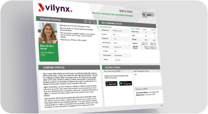 B2B & SAAS MachineLearning 5-second Video Previews SPEAKER PROFILE KEY COMPANY FACTS • Elisenda is the CTO and Co-Founder of Vilynx Key Corporate Facts Traffic Aug-17 Aug-18 • She is an expert on machine learning and complex Headquarters Palo Alto, CA, US Unique Users 11k <5k SW architectures • She has worked on adaptive satellite control systems Founded 2011 Visits 35k 7k and received the 2013 Google Faculty Research Awards Employees 11-50 Minutes 00:23 00:31 • Elisenda has a PhD from UPC and MIT Active Markets Global Sessions Mobile: 83% Mobile: 47% Desktop: 17% Desktop: 53% Ownership Private – VCs Aug 2018 Direct: 72%, Search: 21%, Elisenda Bou- Sources Referrals: 3%, Other: 4% Balust Funding $8m Co-Founder & Key Investors Kibo Ventures CTO Website vilynx.com COMPANY PROFILE VILYNX @ NOAH Doing Business @ NOAH Main Presentation Topics • Vilynx makes video smarter and work harder for publishers/media with machine learning technology. Engage your audiences with video personalization. We add Present your business proposal through N/A rich metadata to enable search and social sharing. We change the way people NOAH Connect app watch online video content by making it instantly discoverable. It automatically generate a grid of 5-second clips for videos of any length, this grid serves as a window into the video, providing a quick overview of the video. • Vilynx’s technology has been tested and validated in different vertical markets with amazing results: video views (click-throughs) have increased by as much as 3x and viewing time has increased as much as 6x. And behind the scenes is Attendees @NOAH Vilynx’s comprehensive data analytics which will change the online video industry. Juan Carlos Riveiro, Co-Founder & CEO • Vilynx provides APIs to develop dashboards which deliver information about Elisenda Bou, Co-Founder & CTO how viewers consume videos, including which portions of the video have the most views and which are not getting attention. Thus Vilynx delivers a strong vertical solution for media and entertainment that provides relevant and unique information to maximize audience engagement and increase ad revenue 134