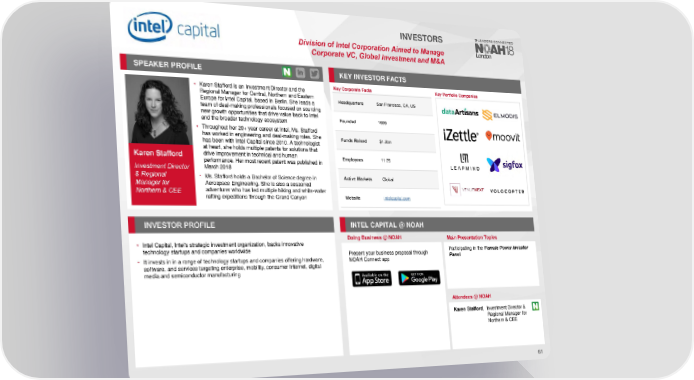INVESTORS Division of Intel Corporation Aimed to Manage Corporate VC, Global Investment and M&A SPEAKER PROFILE KEY INVESTORFACTS • Karen Stafford is an Investment Director and the Key Corporate Facts Key Portfolio Companies Regional Manager for Central, Northern and Eastern Headquarters San Francisco, CA, US Europe for Intel Capital, based in Berlin. She leads a team of deal-making professionals focused on sourcing new growth opportunities that drive value back to Intel Founded 1999 and the broader technology ecosystem • Throughout her 20+ year career at Intel, Ms. Stafford has worked in engineering and deal-making roles. She Funds Raised $1.3bn has been with Intel Capital since 2010. A technologist at heart, she holds multiple patents for solutions that Karen Stafford drive improvement in technical and human Employees 11-25 performance. Her most recent patent was published in March 2018 Investment Director & Regional • Ms. Stafford holds a Bachelor of Science degree in Active Markets Global Manager for Aerospace Engineering. She is also a seasoned adventurer who has led multiple hiking and white-water Northern & CEE rafting expeditions through the Grand Canyon Website intelcapital.com INVESTORPROFILE INTEL CAPITAL @ NOAH Doing Business @ NOAH Main Presentation Topics • Intel Capital, Intel's strategic investment organization, backs innovative technology startups and companies worldwide Present your business proposal through Participating in the Female Power Investor • It invests in in a range of technology startups and companies offering hardware, NOAH Connect app Panel software, and services targeting enterprise, mobility, consumer Internet, digital media and semiconductor manufacturing Attendees @NOAH Karen Stafford, Investment Director & Regional Manager for Northern & CEE 61