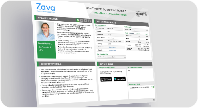 HEALTHCARE, SCIENCE & LEARNING Online Medical Consultation Platform SPEAKER PROFILE KEY COMPANY FACTS • Since starting Zava from David’s living room in London Key Corporate Facts Key Financials in 2011, the company has turned into a global Headquarters London, UK Revenues Run Rate £50m healthcare marketplace used by hundreds of thousands of people Founded 2011 Traffic Aug-17 Aug-18 • David’s work is split between growing the company, Employees 51-100 Unique Users 26k 566k communicating with all stakeholders and working with the team to recruit, hire and retain the best talent for Active Markets International Visits 70k 968k Zava Ownership Private – Business Angels Minutes 00:45 01:03 • Prior to launching Zava, David worked at a leading online healthcare company in London where he Funding £1.2m Sessions Mobile: 85% Mobile: 75% David Meinertz focused on international expansion. Desktop: 15% Desktop: 25% • Before that, David invested in and helped build and re- NOAHContent Zava at NOAH Aug 2018 Direct: 10%, Search: 86%, Co-Founder & build small and medium-sized companies in Website zavamed.com Sources Referrals: 1%, Other: 3% CEO healthcare, electronics and distribution sectors in Europe for about 10 years Key Operating KPIs Patient Consultation per Month 80k COMPANY PROFILE ZAVA@ NOAH Doing Business @ NOAH Main Presentation Topics • Zava offers trustworthy, affordable and regulated medical consultations without the need for a face-to-face visit and with a guaranteed response time of an hour Present your business proposal through N/A to a patient's enquiry NOAH Connect app • Zava was founded with a single purpose: To stop the fear of judgement damaging the world’s health. How? Zava does this by building a global healthcare marketplace that gives people the power and confidence to treat the conditions that society judges most • Zava combines knowledge and experience of medical experts and latest technology to make healthcare more accessible Attendees @NOAH • The company offers numerous services including treatment for sexually David Meinertz,Co-Founder & CEO transmitted infections, impotence and hair loss, as well as contraception, travel medicines, stop smoking medicines, and repeat prescriptions for certain chronic conditions 139