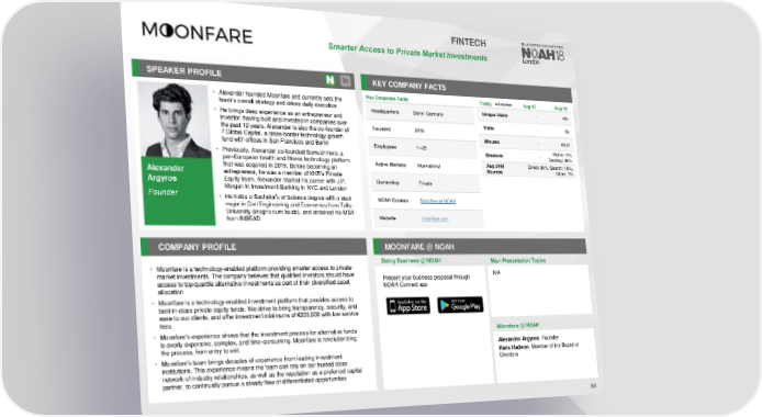 FINTECH Smarter Access to Private Market Investments SPEAKER PROFILE KEY COMPANY FACTS • Alexander founded Moonfare and currently sets the Key Corporate Facts Traffic Aug-17 Aug-18 team’s overall strategy and drives daily execution Headquarters Berlin, Germany Unique Users - <5k • He brings deep experience as an entrepreneur and Visits - 6k investor, having built and invested in companies over Founded 2016 the past 12 years. Alexander is also the co-founder of 7 Global Capital, a cross-border technology growth Minutes - 03:31 fund with offices in San Francisco and Berlin Employees 11-25 Mobile: 2% • Previously, Alexander co-founded Somuchmore, a Sessions - Desktop: 98% pan-European health and fitness technology platform Active Markets International Aug 2018 Direct: 80%, Search: 19%, Alexander that was acquired in 2016. Before becoming an Sources Other: 1% entrepreneur, he was a member of KKR’s Private Argyros Equity team. Alexander started his career with J.P. Ownership Private Morgan in Investment Banking in NYC and London Founder • He holds a Bachelor’s of Science degree with a dual NOAHContent Moonfare at NOAH major in Civil Engineering and Economics from Tufts University (magna cum laude), and obtained his MBA Website moonfare.com from INSEAD COMPANY PROFILE MOONFARE @ NOAH Doing Business @ NOAH Main Presentation Topics • Moonfare is a technology-enabled platform providing smarter access to private market investments. The company believes that qualified investors should have Present your business proposal through N/A access to top-quartile alternative investments as part of their diversified asset NOAH Connect app allocation • Moonfare is a technology-enabled investment platform that provides access to best-in-class private equity funds. We strive to bring transparency, security, and ease to our clients, and offer investment minimums of €200,000 with low service fees. • Moonfare’s experience shows that the investment process for alternative funds Attendees @NOAH is overly expensive, complex, and time-consuming. Moonfare is revolutionizing the process, from entry to exit. Alexander Argyros, Founder • Moonfare’s team brings decades of experience from leading investment Hans Haderer, Member of the Board of institutions. This experience means the team can rely on our trusted close Directors network of industry relationships, as well as the reputation as a preferred capital partner, to continually pursue a steady flow of differentiated opportunities 84