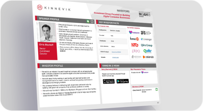 INVESTORS InvestmentGroup Focused on Building Digital Consumer Businesses SPEAKER PROFILE KEY INVESTORFACTS • Chris joined Kinnevik in 2013 and helps lead the Key Corporate Facts Key Portfolio Companies London office Headquarters Stockholm, Sweden • Chris focuses on consumer internet businesses in e- commerce, financial services and healthcare • Holds following board positions: Chairman of Founded 1936 Milvik/BIMA and Saltside, Board Director of Babylon Health, Bayport, Betterment and Quikr and Board Employees 26-80 observer of Livongo • Hewas previously a Managing Director and Head of Chris Bischoff European Media & Internet at Goldman Sachs Active Markets Global • Chris received a BA in History from the University of Senior Bristol, and a M.Sc. in Business Administration from INSEAD NOAH Content Kinnevik at NOAH Investment Director Website kinnevik.com INVESTORPROFILE KINNEVIK @ NOAH Doing Business @ NOAH Main Presentation Topics • Kinnevik is an industry focused investment company with an entrepreneurial spirit. Company purpose is to build the digital consumer businesses that provide Present your business proposal through Fireside chat with more and better choice NOAH Connect app • Kinnevik does this by working in partnership with talented founders and management teams to create, invest in and lead fast growing businesses in developed and emerging markets • The company believes in delivering both shareholder and social value by building well governed companies that contribute positively to society • Kinnevik was founded in 1936 by the Stenbeck, Klingspor and von Horn families Attendees @NOAH • Kinnevik's shares are listed on Nasdaq Stockholm's list for large cap companies Chris Bischoff, Senior Investment under the ticker codes KINV A and KINV B Director 67