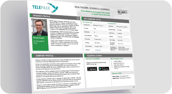 HEALTHCARE, SCIENCE & LEARNING From Medical Archiving to the Leader in Health Cloud Services SPEAKER PROFILE KEY COMPANY FACTS • Rainer Kasan is founder, shareholder and Chief Key Corporate Facts Key Operating KPIs Technical Officer of Telepaxx, the leading European Headquarters Büchenbach, Germany Customers ~600 hospitals & radiologies provider of archiving, sharing and analysing of medical patient data. With a market share of >90% in the Founded 1996 Medical Images 11bn images German outsourced clinical patient data market, Telepaxx is the indisputable German industry leader • As entrepreneur, Rainer founded Digithurst, the sister Employees 16 Data Stored 11 petabytes company of Telepaxx and provider of innovative IT solutions for transmission, encoding and storage of Active Markets Germany Patients 15m per year radiological images. He is shareholder and Managing Rainer Kasan Director of Digithurst Ownership Privately owned New Images +3m per day • Rainer holds a degree in economics and various New Patient Co-Founder & certificates in computer engineering and is verified Funding Self funded 75k per month quality management auditor. He has more than 30 Accounts CTO years of experience in medical IT Key Investors Founders (100%) Certification & DICOM Standard, Data Protection GPDR-Compliance (Europe), Website telepaxx.com Standards HIPAA-Compliance (U.S.) COMPANY PROFILE TELEPAXX @ NOAH • Telepaxx ensures the digital transformation within the healthcare industry and the Doing Business @ NOAH Main Presentation Topics connection of relevant medical data with all involved parties 1. e-Health Platform • Using a new generation of archiving software allows the connection with any cloud Present your business proposal through 2. Medical Data Archiving partner by using Vendor Neutral Archiving (VNA) and secured medical data NOAH Connect app 3. Medical Data Sharing archival (including GDPR file sharing, DICOM images, videos, structured reports 4. Medical Data Analyzing and Deep as well as IHE documents and waveforms) Learning • The company`s GDPR compliant secure file sharing product “HealthDataSpace” connects hospitals, doctors and patients. Currently 75000 new accounts are created per month and patients can share their medical data via browser based Attendees @NOAH devices for all purposes like second opinions etc • Its deep learning business uses 11 petabyte of medical data to identify, train and Rainer Kasan, Co-Founder & CTO integrate algorithms into the clinical workflow (automated detection and diagnosis, Herbert Grau, Co-Founder & Chairman alert systems, automated second diagnosis and optimized work list sorting) • Telepaxx's latest projects include the clinical evaluation of 4 AI-Classifiers, which are developed together with first-class research partners including Fraunhofer MEVIS (Bremen) and the Technical University Munich (TUM) 128