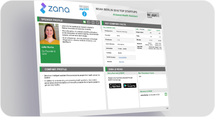 NOAH BERLIN 2018 TOP STARTUPS 2 AI-based Health Assistant SPEAKER PROFILE KEY COMPANY FACTS • Julia is former postdoctoral research scientist in Key Corporate Facts Traffic Aug-17 Aug-18 Medical Informatics at Columbia University Headquarters Karlsruhe, Germany Unique Users <5k <5k • She is the author of numerous scientific publications Visits <5k 6k on the intersection of machine learning, recommender Founded 2018 systems, and semantic technologies • As an entrepreneur, she has previously co-founded Employees 4-10 Minutes 01:12 00:09 ShqiperiaCom, Albanian Institute of Science, and Sessions Mobile: - Mobile: 80% MyOffice’AI Active Markets International Desktop: 100% Desktop: 20% Aug 2018 Direct: 22%, Search: 12%, Julia Hoxha Ownership Private – Grants Sources Referrals: 35%, Other: 31% Co-Founder & Funding €270k CEO NOAHContent Zana at NOAH Website zana.com COMPANY PROFILE ZANA @ NOAH Doing Business @ NOAH Main Presentation Topics • Zana is an intelligent assistant that accompanies people from health concern to solution Present your business proposal through N/A • In addition to understanding and answering health questions, Zana makes NOAH Connect app personalized recommendations of innovative products that empower people to get and stay healthy Attendees @NOAH Julia Hoxha, Co-Founder & CEO 138