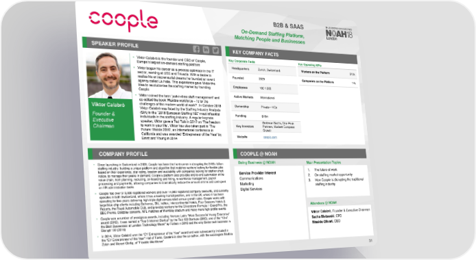 B2B & SAAS On-DemandStaffing Platform, Matching People and Businesses SPEAKER PROFILE KEY COMPANY FACTS • Viktor Calabròis the founder and CEO of Coople, Key Corporate Facts Key Operating KPIs Europe’s largest on-demand staffing platform Headquarters Zurich, Switzerland Workers on the Platform 310k • Viktor began his career as a process optimiser in the IT sector, working at UBS and Trivadis. With a desire to Founded 2009 Companies on the Platform 14k realise his entrepreneurial dreams he founded an event agency called La Folie. This experience gave Viktor the Employees 100-1,000 idea to revolutionise the staffing market by founding Coople • Viktor coined the term ‘just-in-time staff management’ and Active Markets International co-edited the book ‘Flexible workforce – fit for the challenges of the modern world of work?’. In October 2018 Ownership Private – VCs Viktor Calabrò Viktor Calabròwas listed by the Staffing Industry Analysts (SIA) in the “2018 European Staffing 100” most influential Funding $45m Founder & individuals in the staffing industry. A regular keynote speaker, Viktor gave a Ted Talk in 2017 on ‘The freedom Goldman Sachs, One Peak Executive Key Investors Partners, Harbert European to work in your life’. Viktor has also taken part in ‘The Chairman Growth Future: Mobile 2016’, an International conference in California and was awarded ‘Entrepreneur of the Year’ by Website coople.com Ernst and Young in 2014 COMPANY PROFILE COOPLE @ NOAH • Since launching in Switzerland in 2009, Coople has been the front-runner in disrupting the $400+ billion Doing Business @ NOAH Main Presentation Topics staffing industry, building a unique platform and algorithm that matches workers looking for flexible jobs based on their experience, star-rating, location and availability with companies looking for staff on short Service Provider Interest 1. The future of work notice, to manage their peaks in demand. Coople’s platform also provides end-to-end automation of the 2. On-staffing market opportunity value chain, from planning, recruiting, on-boarding and hiring, to workforce management, payroll Communications processing and payments, allowing companies to dramatically reduce the amount of time and cost spent Marketing 3. How Coople is disrupting the traditional on HR administration tasks staffing industry • Coople has over 310,000 registered workers and over 14,000 registered company accounts, and currently Digital Services operates in both Switzerland, where it has a leading market position, and in the UK, where it has been operating for two years delivering high-triple digit compounded annual growth rates. Coople works with large blue-chip clients including Deliveroo, ZfV, Inditex, Intercontinental Hotels, Four Seasons Hotels & Resorts, the Royal Automobile Club, and provides workers for the Silverstone Formula 1 Grand Prix, the Attendees @NOAH BBC Proms, Coldplay concerts, NFL matches at Wembley stadium and many more high-profile events • Coople won a number of prestigious awards, including Venture Lab’s “Most Successful Young Enterprise” Viktor Calabrò, Founder & Executive Chairman award (2012). It was named a “Top 3 Internet Startup” by the Top 100 Startups (2013), one of the “10 of Sacha Bielawski, CFO the Best Businesses at London Technology Week” by Forbes in 2016 and the only Swiss tech business in Disrupt 100 (2016) Rinaldo Olivari, CEO • In 2014, Viktor Calabrò won the “EY Entrepreneur of the Year” award and was subsequently included in the “EY Entrepreneur of the Year” Hall of Fame. Calabrò is also the co-author, with the sociologists Martina Zolch and Marcel Oertig, of “Flexible Workforce” 31
