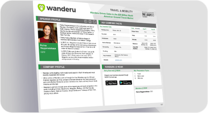 TRAVEL & MOBILITY WanderuDrives Sales to the $30 Billion North American Ground Travel Market SPEAKER PROFILE KEY COMPANY FACTS • Polina Raygorodskaya is the co-founder and CEO of Key Corporate Facts Traffic Aug-17 Aug-18 Wanderu, the leading multi-modal travel search in Headquarters Boston, MA, US Unique Users 2.1m 2.1m North America. Prior to establishing Wanderu, Polina was the founder and president of Polina Fashion, a Founded 2012 Visits 3.4m 3.4m boutique fashion, travel and luxury PR firm based in New York City • Polina holds a Bachelor of Science degree in Employees 26-50 Minutes 04:03 03:52 Business Administration from Babson College Mobile: 62% Mobile: 62% • In 2015, Inc. Magazine included Polina in their annual Active Markets International Sessions Desktop: 38% Desktop: 38% Polina 30 Under 30 roundup of the best young entrepreneurs Ownership Private – VCs Aug 2018 Direct: 15%, Search: 82%, and Fortune Magazine featured her in their list of 40 Sources Referrals: 1%, Other: 2% Raygorodskaya Under 40 Women to Watch Funding $8m • In 2016, Polina was featured in Forbes’ annual 30 CEO Under 30 list in the Consumer Tech category. In Compound, Alta Ventures October 2017, Polina was on the cover of Inc. Key Investors Mexico Magazine as one of the most innovative women entrepreneurs in America Website wanderu.com COMPANY PROFILE WANDERU @ NOAH Doing Business @ NOAH Main Presentation Topics • Wanderuis the leading multi-modal travel search in North America and most recently expanded into Europe Present your business proposal through 1. Travel • Either online at Wanderu.com or through the free Wanderu app for iOS and NOAH Connect app 2. Multi-modal Android, travelers can find, compare and book tickets for the most convenient 3. Millenials and cost-effective itineraries across numerous bus, train and ferry lines in North America and Europe • Wanderu’s partners include some of the largest ground travel companies in the world, including Amtrak, Greyhound, Megabus, Boltbus, VIA Rail Canada, Deutsche Bahn, National Express, Grupo Senda and Trailways of New York, Attendees @NOAH among many others Polina Raygorodskaya, CEO 137
