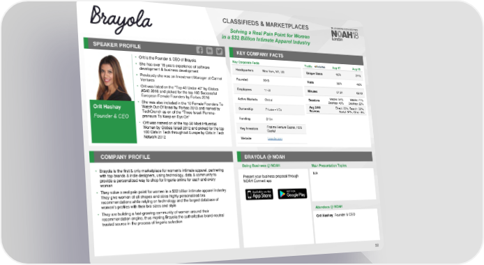 CLASSIFIEDS & MARKETPLACES Solving a Real Pain Point for Women in a $3 2 Billion Intimate Apparel Industry SPEAKER PROFILE KEY COMPANY FACTS • Orit is the Founder & CEO of Brayola Key Corporate Facts Traffic Aug-17 Aug-18 • She has over 15 years experience of software Headquarters New York, NY, US Unique Users 187k 241k development & business development • Previously she was an Investment Manager at Carmel Founded 2013 Visits 397k 462k Ventures • Orit was listed on the "Top 40 Under 40" by Globes Employees 11-50 Minutes 01:24 02:43 #G40 2016 and picked for the top 100 Successful Sessions Mobile: 54% Mobile: 77% European Female Founders by Forbes 2016 Active Markets Global Desktop: 46% Desktop: 23% • She was also included in the 10 Female Founders To Aug 2018 Direct: 23%, Search: 32%, Orit Hashay Watch Out Of Israel by Forbes 2013 and named by Ownership Private – VCs Sources Social: 37%, Other: 8% TechCrunch as on of the "Three Israeli Femme- preneurs To Keep an Eye On" Funding $10m Founder & CEO • Orit was named on of the top 50 Most Influential Firstime Venture Capital, HDS Women by Globes Israel 2012 and picked for the top Key Investors Capital 100 Girls in Tech throughout Europe by Girls in Tech Network 2012 Website brayola.com COMPANY PROFILE BRAYOLA @ NOAH Doing Business @ NOAH Main Presentation Topics • Brayola is the first & only marketplace for women's intimate apparel, partnering with top brands & indie designers, using technology, data & community to Present your business proposal through N/A provide a personalized way to shop for lingerie online for each and every NOAH Connect app woman • They solve a real pain point for women in a $32 billion intimate apparel industry. They give women of all shapes and sizes highly personalized bra recommendations while relying on technology and the largest database of women’s profiles with their bra sizes and style • They are building a fast-growing community of women around their Attendees @NOAH recommendation engine, thus making Brayola the authoritative brand-neutral trusted source in the process of lingerie selection Orit Hashay, Founder & CEO 22
