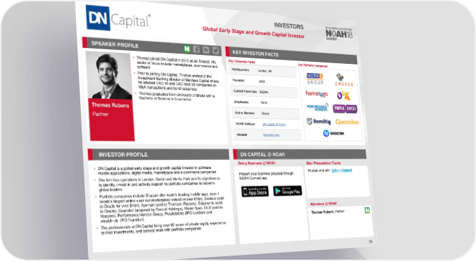 INVESTORS Global Early Stage and Growth Capital Investor SPEAKER PROFILE KEY INVESTORFACTS • Thomas joined DN Capital in 2012 as an Analyst. His Key Corporate Facts Key Portfolio Companies sector of focus include marketplaces, ecommerce and Headquarters London, UK software • Prior to joining DN Capital, Thomas worked in the Founded 2000 Investment Banking division of Barclays Capital where he advised CAC 40 and CAC Next 20 companies on M&A transactions and bond issuances Current Fund Size €200m • Thomas graduated from University of Bristol with a Bachelor of Science in Economics Employees 26-50 Thomas Rubens Active Markets Global Partner NOAHContent DN Capital at NOAH Website dncapital.com INVESTORPROFILE DN CAPITAL @ NOAH Doing Business @ NOAH Main Presentation Topics • DN Capital is a global early stage and growth capital investor in software, mobile applications, digital media, marketplace and e-commerce companies Present your business proposal through Fireside chat with • The firm has operations in London, Berlin and Menlo Park and its objectives is NOAH Connect app to identify, invest in and actively support its portfolio companies to become global leaders • Portfolio companies include Shazam (the world’s leading mobile app), Auto 1 (world’s largest online used car marketplace valued at over €1bn), Endeca (sold to Oracle for over $1bn), Apsmart (sold to Thomson Reuters), Datanomic (sold to Oracle), Quandoo (acquired by Recruit Holdings), Mister Spex, OLX (sold to Attendees @NOAH Naspers), Performance Horizon Group, Purplebricks (IPO London) and windeln.de (IPO Frankfurt) Thomas Rubens,Partner • The professionals at DN Capital bring over 60 years of private equity experience to their investments, and actively work with portfolio companies 36