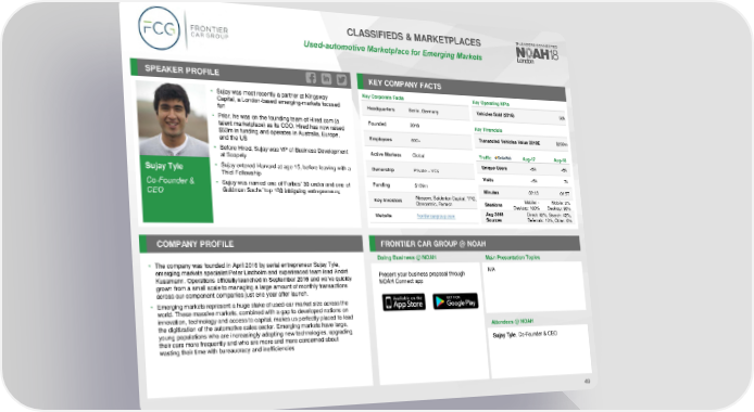CLASSIFIEDS & MARKETPLACES Used-automotive Marketplacefor Emerging Markets SPEAKER PROFILE KEY COMPANY FACTS • Sujay was most recently a partner at Kingsway Key Corporate Facts Key Operating KPIs Capital, a London-based emerging-markets focused Headquarters Berlin, Germany Vehicles Sold (2016) 50k fun • Prior, he was on the founding team of Hired.com (a Founded 2016 Key Financials talent marketplace) as its COO. Hired has now raised $53m in funding and operates in Australia, Europe, Employees 600+ Transacted Vehicles Value 2018E $250m and the US • Before Hired, Sujay was VP of Business Development Active Markets Global Traffic Aug-17 Aug-18 at Scopely Unique Users <5k <5k Sujay Tyle • Sujay entered Harvard at age 15, before leaving with a Ownership Private – VCs Thiel Fellowship Visits <5k 7k Funding $169m Co-Founder & • Sujay was named one of Forbes’ 30 under and one of Minutes 02:13 01:57 Goldman Sachs’ top 100 intriguing entrepreneurs CEO Naspers, Balderton Capital, TPG, Mobile: - Mobile: 2% Key Investors Concentric, Partech Sessions Desktop: 100% Desktop: 98% Website frontiercargroup.com Aug 2018 Direct: 42%, Search: 42%, Sources Referrals: 10%, Other: 6% COMPANY PROFILE FRONTIER CAR GROUP @ NOAH Doing Business @ NOAH Main Presentation Topics • The company was founded in April 2016 by serial entrepreneur Sujay Tyle, N/A emerging markets specialist Peter Lindholm and experienced team lead André Present your business proposal through Kussmann. Operations officially launched in September 2016 and we’ve quickly NOAH Connect app grown from a small scale to managing a large amount of monthly transactions across our component companies just one year after launch. • Emerging markets represent a huge stake of used-car market size across the world. These massive markets, combined with a gap to developed nations on innovation, technology and access to capital, makes us perfectly placed to lead the digitization of the automotive sales sector. Emerging markets have large, Attendees @NOAH young populations who are increasingly adopting new technologies, upgrading their cars more frequently and who are more and more concerned about Sujay Tyle, Co-Founder & CEO wasting their time with bureaucracy and inefficiencies 49