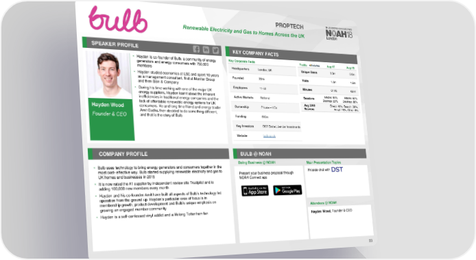 PROPTECH RenewableElectricityand Gas to HomesAcross the UK SPEAKER PROFILE KEY COMPANY FACTS • Hayden is co-founder of Bulb, a community of energy Key Corporate Facts Traffic Aug-17 Aug-18 generators and energy consumers with 750,000 Headquarters London, UK Unique Users 0.3m 0.8m members • Hayden studied economics at LSE and spent 10 years Founded 2014 Visits 1.0m 1.6m as a management consultant, first at Monitor Group and then Bain & Company Employees 11-50 Minutes 01:46 03:41 • During his time working with one of the major UK Mobile: 80% Mobile: 62% energy suppliers, Hayden learnt about the inherent Active Markets National Sessions Desktop: 20% Desktop: 38% inefficiencies in traditional energy companies and the lack of affordable renewable energy options for UK Aug 2018 Direct: 48%, Search: 30%, Hayden Wood consumers. He and long time friend and energy trader Ownership Private – VCs Sources Email: 16%, Other: 6% Amit Gudka then decided to do something different, and that is the story of Bulb Funding £60m Founder & CEO Key Investors DST Global, JamJar Investments Website bulb.co.uk COMPANY PROFILE BULB @ NOAH Doing Business @ NOAH Main Presentation Topics • Bulb uses technology to bring energy generators and consumers together in the most cost- effective way. Bulb started supplying renewable electricity and gas to Present your business proposal through Fireside chat with UK homes and businesses in 2015 NOAH Connect app • It is now rated the #1 supplier by independent review site Trustpilot and is adding 100,000 new members every month • Hayden and his co-founder Amit have built all aspects of Bulb’s technology led operation from the ground up. Hayden’s particular area of focus is in membership growth, product development and Bulb’s unique emphasis on growing an engaged member community Attendees @NOAH • Hayden is a self-confessed vinyl addict and a lifelong Tottenham fan Hayden Wood,Founder & CEO 23