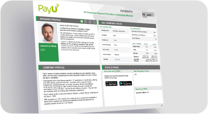 PAYMENTS #1 Financial Payment Provider in Emerging Markets SPEAKER PROFILE KEY COMPANY FACTS • Laurent is the CEO of PayU Key Corporate Facts Key Operating KPIs • Le Moal brings extensive knowledge of digital Headquarters Hoofddorp, Netherlands Payments Channels Available 300+ payments and emerging markets to PayU Merchants on the Platform 100k+ • He culminated an 11-year career at PayPal as VP for Founded 2006 Continental Europe, Russia, Middle-East and Africa, Active Markets 133 leading the growth of its consumer franchise across Employees 1,000+ diverse geographies • Laurent Le Moal leads PayU’s strategy and growth, Traffic Aug-17 Aug-18 Active Markets Global building on the company’s position in high growth Unique Users 4.3m 5.9m Laurent Le Moal markets around the world and developing payment solutions which meet the local market needs of both Ownership Private Visits 7.7m 10.8m consumers and merchants CEO Minutes 02:06 01:59 Key Investors Naspers Mobile: 35% Mobile: 34% Sessions Desktop: 65% Desktop: 66% Website payu.com Aug 2018 Direct: 3%, Search: 1%, Sources Referrals: 90%, Other: 6% COMPANY PROFILE PAYU @ NOAH Doing Business @ NOAH Main Presentation Topics • PayUmeans innovative solutions, dynamic development and reliability. Since 2006, we have been conquering the online payments market not only in Poland Present your business proposal through N/A but also in worldwide NOAH Connect app • Partnerships form PayU Group operate in 17 countries on 4 continents, offering over 300 various payment channels – transfers online, payment cards, installments, delayed payment, one-click, recurring. We are committed to continuously improving our offer so that it meets and even exceeds the expectations of our 100,000+ merchants and millions of buyers. They all make our everyday work an exciting and challenging experience Attendees @NOAH • PayUmakes up the e-payments division Naspers, a South African multinational founded in 1915 Laurent Le Moal, CEO • With operations in 133 markets, this media group is ranked third worldwide in terms of the number of e-commerce customers served and presents the greatest upward dynamics in its industry 97