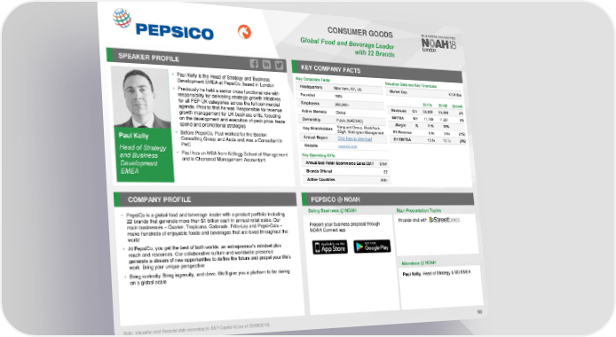 CONSUMER GOODS Global Food and BeverageLeader with 22 Brands SPEAKER PROFILE KEY COMPANY FACTS • Paul Kelly is the Head of Strategy and Business Key Corporate Facts Valuation Data and Key Financials Development EMEAat PepsiCo, based in London Headquarters New York, NY, US Market Cap €134.8bn • Previously he held a senior cross functional role with Founded 1965 responsibility for delivering strategic growth initiatives Employees 260,000+ 2017A 2018E Growth for all PEP UK categories across the full commercial Revenues €m 53,829 55,088 2% agenda. Prior to that he was Responsible for revenue Active Markets Global EBITDA €m 11,169 11,221 0% growth management for UK business units, focusing Ownership Public (NASDAQ) on the development and execution of pack price, trade Vanguard Group, BlackRock, Margin % 21% 20% spend and promotional strategies Key Shareholders SSgA, Wellington Management EV/Revenue 2.9x 2.8x (2%) PaulKelly • Before PepsiCo, Paul worked for the Boston Annual Report Click here to download EV/EBITDA 13.8x 13.7x (0%) Consulting Group and Asda and was a Consultant in Website pepsico.com PwC Head of Strategy • Paul has an MBA from Kellogg School of Management Key Operating KPIs and Business and is Chartered Management Accountant Annualized Retail Ecommerce Sales 2017 $1bn Development Brands Offered 22 EMEA Active Countries 200+ COMPANY PROFILE PEPSICO @ NOAH • PepsiCo is a global food and beverage leader with a product portfolio including Doing Business @ NOAH Main Presentation Topics 22 brands that generate more than $1 billion each in annual retail sales. Our Fireside chat with main businesses – Quaker, Tropicana, Gatorade, Frito-Lay and Pepsi-Cola – Present your business proposal through make hundreds of enjoyable foods and beverages that are loved throughout the NOAH Connect app world • At PepsiCo, you get the best of both worlds: an entrepreneur’s mindset plus reach and resources. Our collaborative culture and worldwide presence generate a stream of new opportunities to define the future and propel your life’s work. Bring your unique perspective Attendees @NOAH • Bring curiosity. Bring ingenuity, and drive. We’ll give you a platform to be daring on a global scale Paul Kelly, Head of Strategy & BD EMEA Note: Valuation and financial data according to S&P Capital IQ (as of 25/09/2018). 98