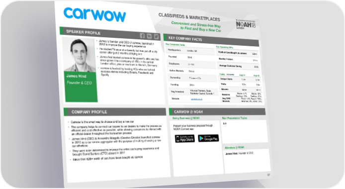 CLASSIFIEDS & MARKETPLACES Convenient and Stress-free Way to Find and Buy a New Car SPEAKER PROFILE KEY COMPANY FACTS • James is founder and CEO of carwow, launched in Key Corporate Facts Key Operating KPIs 2012 to improve the car buying experience Headquarters London, UK Worth of Cars Bought via carwow £2bn+ • He studied Finance at university but was put off a city career after just 2 months of trying one Founded 2010 Monthly Visitors 2.1m+ • James first started carwow in his parent’s attic and has since grown it to a company of 150+ in its central Employees 51-100 Average Customer Saving £3.6k London office, plus a new team in Munich, Germany. • carwow is backed by leading VCs who are behind Active Markets Global Traffic Aug-17 Aug-18 success stories including Zoopla, Facebook and James Hind Spotify Ownership Private – VCs Unique Users 1.7m 2.1m Funding $66m Visits 3.2m 3.9m Founder & CEO Vitruvian Partners, Accel, Minutes 02:43 03:14 Key Investors Balderton Capital, Episode 1 Sessions Mobile: 57% Mobile: 63% Desktop: 43% Desktop: 37% Website carwow.co.uk Aug 2018 Direct: 14%, Search: 74%, Sources Referrals: 2%, Other: 10% COMPANY PROFILE CARWOW @ NOAH Doing Business @ NOAH Main Presentation Topics • Carwowis the smart way to choose and buy a new car • The company helps to connect car buyers to car dealers to make the process as Present your business proposal through N/A efficient and cost effective as possible, while allowing consumers to interact with NOAH Connect app an official dealer throughout the transaction process • James Hind (CEO) & Alexandra Margolis (Creative Director) launched carwow in 2010 as a car review aggregator with the purpose of making choosing a new car effortless • They were soon determined to improve the entire car buying experience and Attendees @NOAH brought David Santoro (CTO) aboard in 2011 • Since then £2B+ worth of cars have been bought via carwow James Hind, Founder & CEO 27