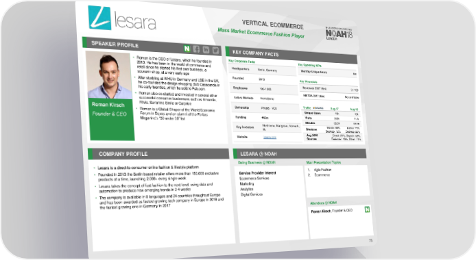 VERTICAL ECOMMERCE Mass MarketEcommerce FashionPlayer SPEAKER PROFILE KEY COMPANY FACTS • Roman is the CEO of Lesara, which he founded in Key Corporate Facts Key Operating KPIs 2013. He has been in the world of commerce and Headquarters Berlin, Germany Monthly Unique Users 8m retail since he started his first own business, a souvenir shop, at a very early age Founded 2013 Key Financials • After studying at WHU in Germany and LSE in the UK, Revenues 2017 (€m) 51-100 he co-founded the design shopping club Casacanda in Employees 100-1,000 his early twenties, which he sold to Fab.com EBITDA 2017 (€m) Not profitable • Roman also co-started and invested in several other Active Markets Inernational successful consumer businesses such as Amorelie, Roman Kirsch Fitvia, Sunshine Smile or Carprice Ownership Private - VCs Traffic Aug-17 Aug-18 • Roman is a Global Shaper of the World Economic Unique Users 46k 43k Forum in Davos and an alumni of the Forbes Funding €90m Visits 246k 117k Founder & CEO Magazine’s “30 under 30” list Minutes 03:27 02:09 Key Investors Northzone, Mangrove, Vorwerk, Sessions Mobile: 88% Mobile: 74% 3L Desktop: 12% Desktop: 26% Website lesara.com Aug 2018 Direct: 21%, Search: 52%, Sources Referrals: 16%, Other: 11% COMPANY PROFILE LESARA @ NOAH Doing Business @ NOAH Main Presentation Topics • Lesara is a direct-to-consumer online fashion & lifestyle platform • Founded in 2013 the Berlin based retailer offers more than 150.000 exclusive Service Provider Interest 1. Agile Fashion products at a time, launching 2.000+ every single week Ecommerce Services 2. Ecommerce • Lesara takes the concept of fast fashion to the next level, using data and Marketing automation to produce new emerging trends in 2-4 weeks Analytics • The company is available in 8 languages and 24 countries throughout Europe Digital Services and has been awarded as fastest growing tech company in Europe in 2016 and the fastest growing one in Germany in 2017 Attendees @NOAH Roman Kirsch, Founder & CEO 75