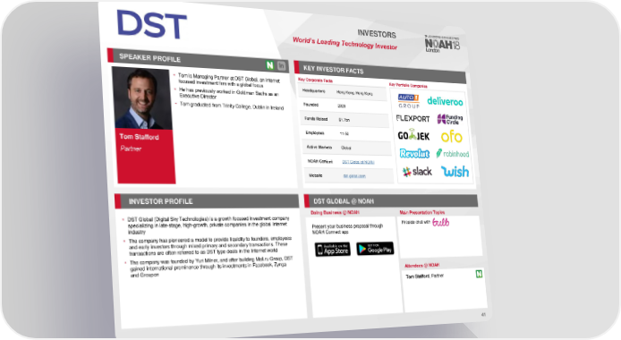 INVESTORS World’s Leading Technology Investor SPEAKER PROFILE KEY INVESTORFACTS • Tom is Managing Partner at DST Global, an internet Key Corporate Facts Key Portfolio Companies focused investment firm with a global focus Headquarters Hong Kong, Hong Kong • He has previously worked in Goldman Sachs as an Executive Director Founded 2009 • Tom graduated from Trinity College, Dublin in Ireland Funds Raised $1.7bn Employees 11-50 Tom Stafford Active Markets Global Partner NOAHContent DST Global at NOAH Website dst-global.com INVESTORPROFILE DST GLOBAL @ NOAH Doing Business @ NOAH Main Presentation Topics • DST Global (Digital Sky Technologies) is a growth focused investment company specializing in late-stage, high-growth, private companies in the global Internet Present your business proposal through Fireside chat with industry NOAH Connect app • The company has pioneered a model to provide liquidity to founders, employees and early investors through mixed primary and secondary transactions. These transactions are often referred to as DST type deals in the Internet world • The company was founded by Yuri Milner, and after building Mail.ru Group, DST gained international prominence through its investments in Facebook, Zynga and Groupon Attendees @NOAH Tom Stafford, Partner 41