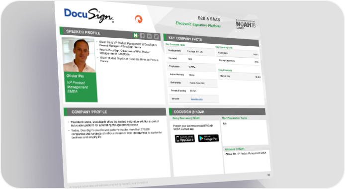 B2B & SAAS Electronic Signature Platform SPEAKER PROFILE KEY COMPANY FACTS • Olivier Pin is VP Product Management at DocuSign & Key Corporate Facts Key Operating KPIs General Manager of DocuSign France Headquarters Purchase, NY, US Customers 100m+ • Prior to DocuSign, Olivier was a VP of Product Management in Salesforce Founded 1966 Paying Customers 370k+ • Olivier studied Physics at Ecole des Mines de Paris in France Employees 10,000+ VKeyFinancials Active Markets Global Market Cap $6.6bn Olivier Pin Ownership Public (NASDAQ) VP Product Management Private Funding $515m EMEA Website docusign.com COMPANY PROFILE DOCUSIGN @ NOAH Doing Business @ NOAH Main Presentation Topics • Founded in 2003, DocuSign® offers the leading e-signature solution as part of its broader platform for automating the agreement process Present your business proposal through N/A • Today, DocuSign's cloud-based platform enables more than 370,000 NOAH Connect app companies and hundreds of millions of users in over 180 countries to accelerate business and simplify life Attendees @ NOAH Olivier Pin, VP Product Management EMEA All financial actual data and estimates provided by CapitaIQ, as of 21/10/2018 38