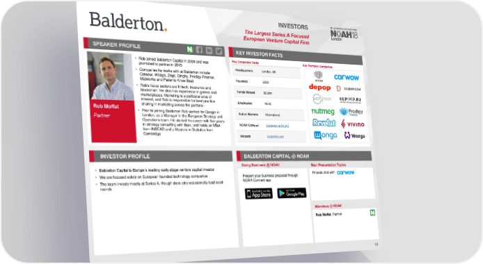 INVESTORS The Largest Series A Focused European Venture Capital Firm SPEAKER PROFILE KEY INVESTORFACTS • Rob joined Balderton Capital in 2009 and was Key Corporate Facts Key Portfolio Companies promoted to partner in 2015 Headquarters London, UK • Companies he works with at Balderton include Carwow, Wooga, Zego, Dinghy, Prodigy Finance, Founded 2000 Mojiworks and Patients Know Best • Rob's focus sectors are fintech, insurance and Funds Raised $2.3bn blockchain. He also has experience in games and marketplaces. Marketing is a particular area of interest, and Rob is responsible for best practice Employees 26-50 Rob Moffat sharing in marketing across the portfolio • Prior to joining Balderton Rob worked for Google in Active Markets International London, as a Manager in the European Strategy and Partner Operations team. He started his career with five years in strategy consulting with Bain, and holds an MBA NOAHContent Balderton at NOAH from INSEAD and a Masters in Statistics from Cambridge Website balderton.com INVESTORPROFILE BALDERTON CAPITAL @ NOAH Doing Business @ NOAH Main Presentation Topics • Balderton Capital is Europe’s leading early-stage venture capital investor • We are focused solely on European founded technology companies Present your business proposal through Fireside chat with • The team invests mostly at Series A, though does also occasionally lead seed NOAH Connect app rounds Attendees @NOAH Rob Moffat,Partner 18