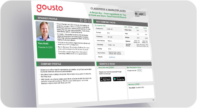 CLASSIFIEDS & MARKETPLACES A Recipe Box - Fresh Ingredients for You to Cook and Share. Good Food All Round! SPEAKER PROFILE KEY COMPANY FACTS • Timo is Founder and CEO of Gousto, the leading UK Key Corporate Facts Traffic Aug-17 Aug-18 recipe box company. He's on a mission to fuel family Headquarters London, UK Unique Users 0.3m 0.2m life through good food, reducing food waste to 0% and building the very best value proposition (most choice, Founded 2012 Visits 0.7m 0.5m best delivery options, lowest price point) • In 5 years, Timo scaled Gousto to 400 employees, Employees 100-1,000 Minutes 02:27 03:23 raised almost $100m from world leading investors, built a high performing leadership team, and built a Active Markets National Sessions Mobile: 70% Mobile: 60% leading AI and tech platform Desktop: 30% Desktop: 40% • Timo sits on the Unilever Digital Advisory Board and Ownership Private – VCs Aug 2018 Direct: 40%, Search: 47%, Timo Boldt used to be a VP in a hedge fund Sources Referrals: 3%, Other: 10% • Born in Germany, Timo lived in California for many Funding $77m Founder & CEO years, and has lived in the UK for over ten years • Timo holds a master degree from University of Key Investors Hargreave Hale, Unilever Cambridge (MBA) where he is a guest lecturer Ventures, MMC Ventures Website gousto.co.uk COMPANY PROFILE GOUSTO @ NOAH Doing Business @ NOAH Main Presentation Topics • Gousto is an online meal-kit manufacturer and retailer, using AI and automation to provide extensive choice and personalisation Present your business proposal through Fireside chat with • We believe home cooking is important. But in today’s busy world, it’s often the NOAH Connect app first thing to go • With Gousto, you choose recipes you’d like to cook and ta-dah! We deliver the perfectly measured ingredients. Skip the supermarket queue, and create delicious meals to share with those you love Attendees @NOAH Timo Boldt, Founder & CEO 55