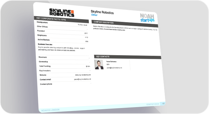 SkylineRobotics Other KEY CORPORATE FACTS /KPIS COMPANYDESCRIPTION Headquarters Tel Aviv, IsraelSkyline Robotics is creating the fist Operating System (OS) for work at height, starting with window cleaning. Our first OtherOffices - product is Ozmo, the automated window cleaning robot. Founded 2017 Employees 4-10 ActiveMarkets USA Business Overview Skyline provides cleaning companies with tehnology , service, support and training, and has a rev share on total area cleaned. Revenues - KEYCONTACTS Ownership - Yaron Schwarcz CEO Total Funding $2.8m yaron@skylinerobotics.net KeyInvestors - Website www.skylinerobotics.net Contactemail yaron@skylinerobotics.net Contactphone - NOAH18LONDON STARTUP BOOK 177