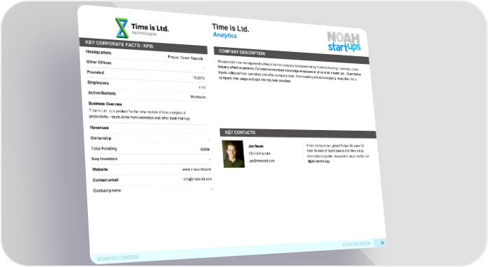 Time isLtd. Analytics KEY CORPORATE FACTS /KPIS COMPANYDESCRIPTION Headquarters Prague, Czech RepublicResponsible time management software for the company level powered by machine learning. Leverage cross- OtherOffices - industry effective patterns. Collected anonymized knowledge empowers all of us to do a better job. Quantitative inputs collected from calendars and other company tools. Time tracking and sociomapping deep dive into a Founded 10/2015 company time usage and spot the truly best practices. Employees 4-10 ActiveMarkets Worldwide Business Overview Time is Ltd. is a product for the new market of time analytics & productivity. Inputs come from calendars and other tools that sup Revenues - KEYCONTACTS Ownership - Jan Rezab Serial entrepreneur, global Forbes 30 under 30 TotalFunding €300k CEO & Founder lister, founder of Socialbakers and Time is Ltd. KeyInvestors - International speaker focused on social media and jan@timeisltd.com digital technology Website www.timeisltd.com/ Contactemail info@timeisltd.com Contactphone - NOAH18LONDON STARTUPBOOK 20
